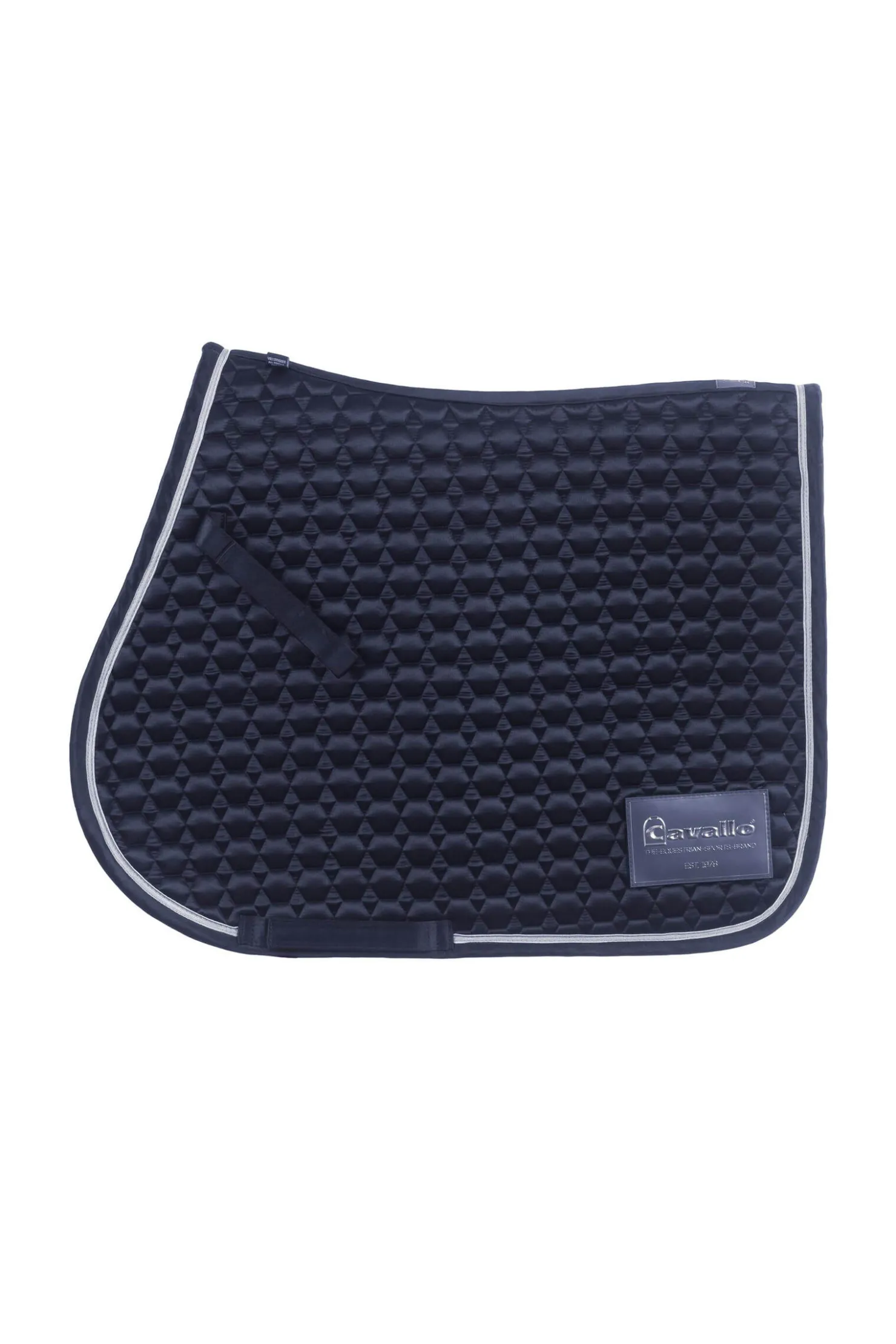 Sadelunderlag med allover quilt i honningkakeutseende. En sølvkant rammer inn sadelunderlaget. Sadelen har en avtagbar etikett der startnummeret kan festes. Fire sett med nummer følger med sadelunderlaget. Den hurtigtørkende og fukttransporterende nettingfôret er spesielt hudvennlig og gir maksimal komfort. En formfast polstring tillater en perfekt posisjonering av salen på hestens rygg. De øvre gjordremmene kan festes med borrelås. De nedre gjordremmene med tre indre festesløyfer sikrer nøyaktig posisjonering av salen.
