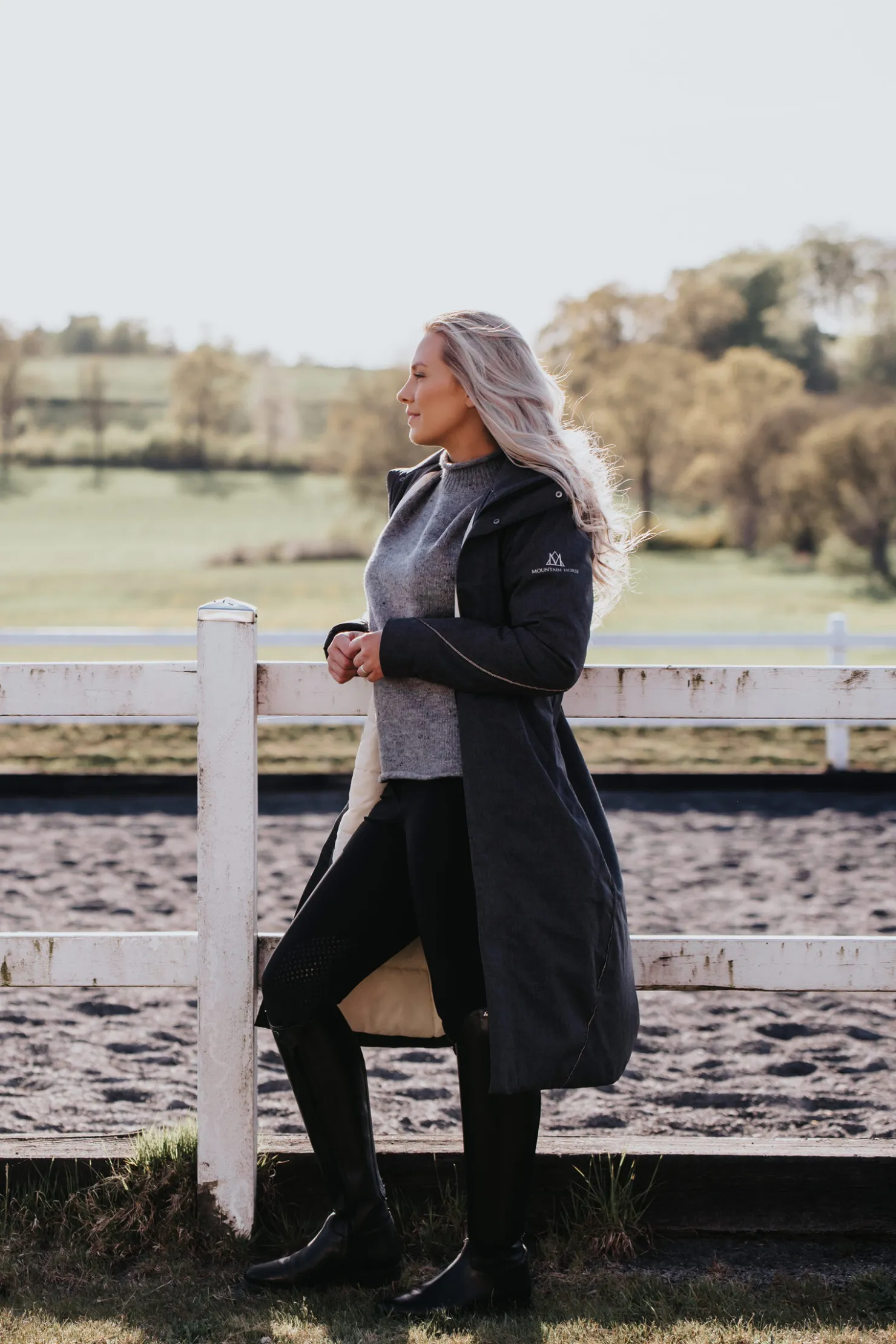 Alicia er en lett, fôret frakk med avtakbar hette.Den vanntette og vindtette frakken har en feminin passform som gir en fin form til figuren..Det er reflekterende detaljer på ermene, bak og foran.Dette gjør deg også godt synlig i mørket.Med toveis glidelås og lang ridesplitt bak som kan åpnes og lukkes med trykknapper er denne frakken ideell for ridning.For oppbevaring av godbiter og mobilen har du frontlommer med glidelås, eller en innvendig lomme i mesh-stoff.