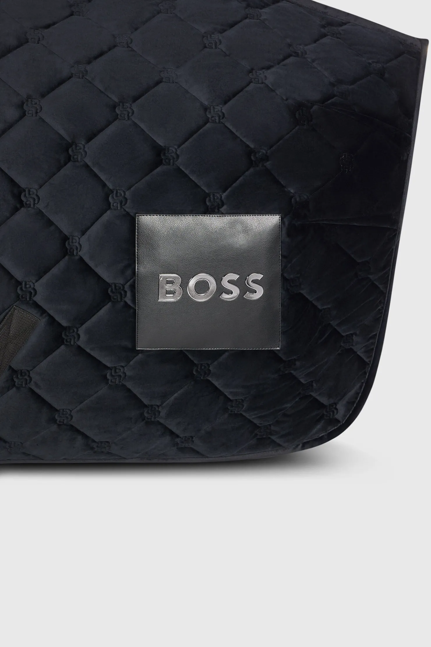 BOSS stevnedekken er anatomisk formet og har en perfekt passform. Den kunstige sauepelsen i nakke-, manke- og brystområdet sikrer en behagelig passform. Den ekstremt myke fløyelsyttersiden med BOSS-logoquilt over hele ser veldig luksuriøs ut. High-tech fiberet på innsiden forhindrer gnag og skaper små luftbobler som fanger og holder på kroppsvarmen. I tillegg får hestens pels glans ved kontakt med dette myke innermaterialet. Forholdet mellom varme og vekt maksimerer komforten for både rytter og hest. Det trelags diamantquiltet gjør stevnedekkenet svært slitesterkt og forhindrer at flis setter seg fast i stoffet. Den doble frontlukningen, magestroppen og halesnoren fullfører sikkerheten til stevnedekkenet.