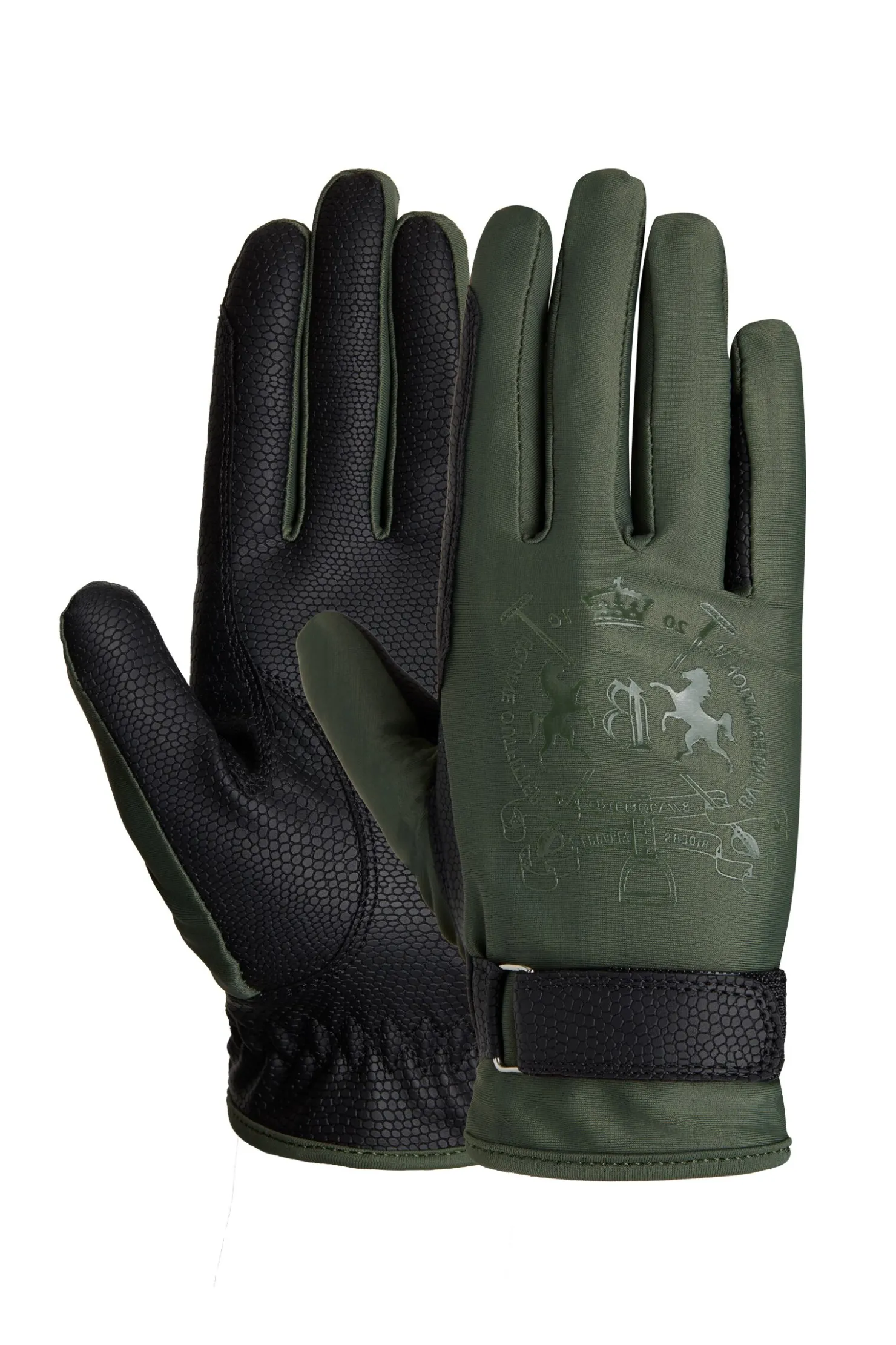 Disse tidløse og elegante hanskene kan brukes året rundt.Det elastiske stoffet på håndbaken gjør dem komfortable å bruke, mens stoffet på håndflaten sikrer et godt grep om tøylene.En justerbar borrelås rundt håndleddet fikserer hansken der den skal være.Designet er dekorert med et pent varmepreget logo på håndbaken på begge hender.