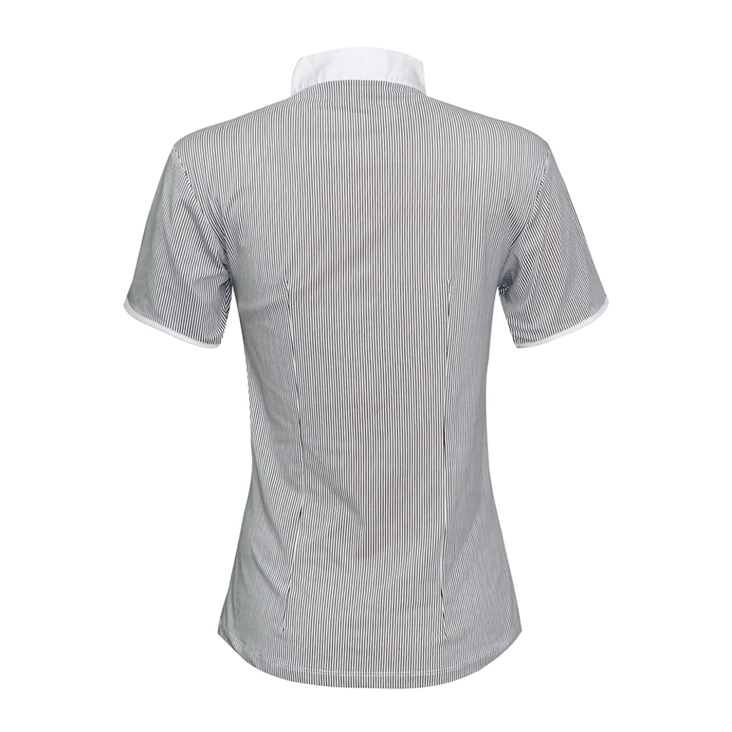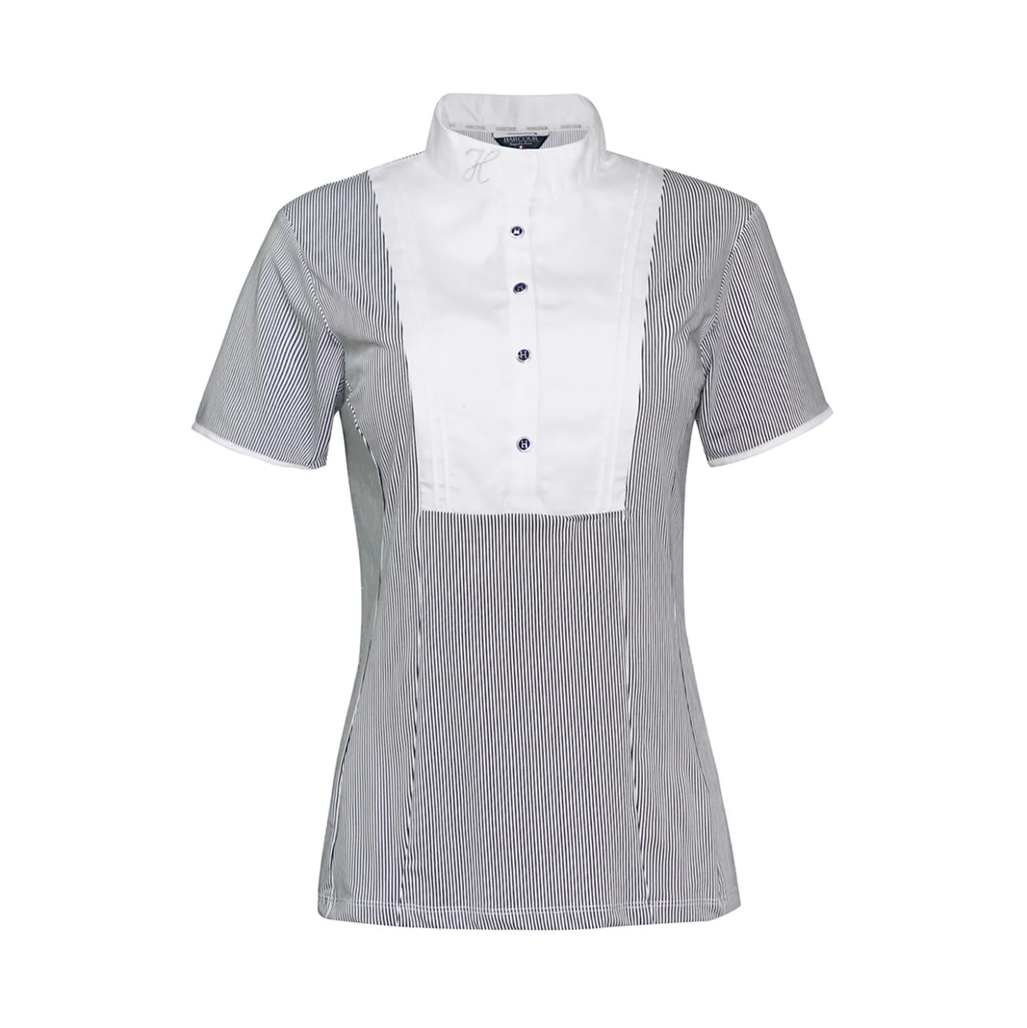 Damepoloskjorte til stevne fra Harcour, med korte ermer.Svært elegant med det hvite brystpartiet.Brystpartiet er laget med et elastisk materiale. Lett og pustende.Magnetknapp på kragen.Slim fit.