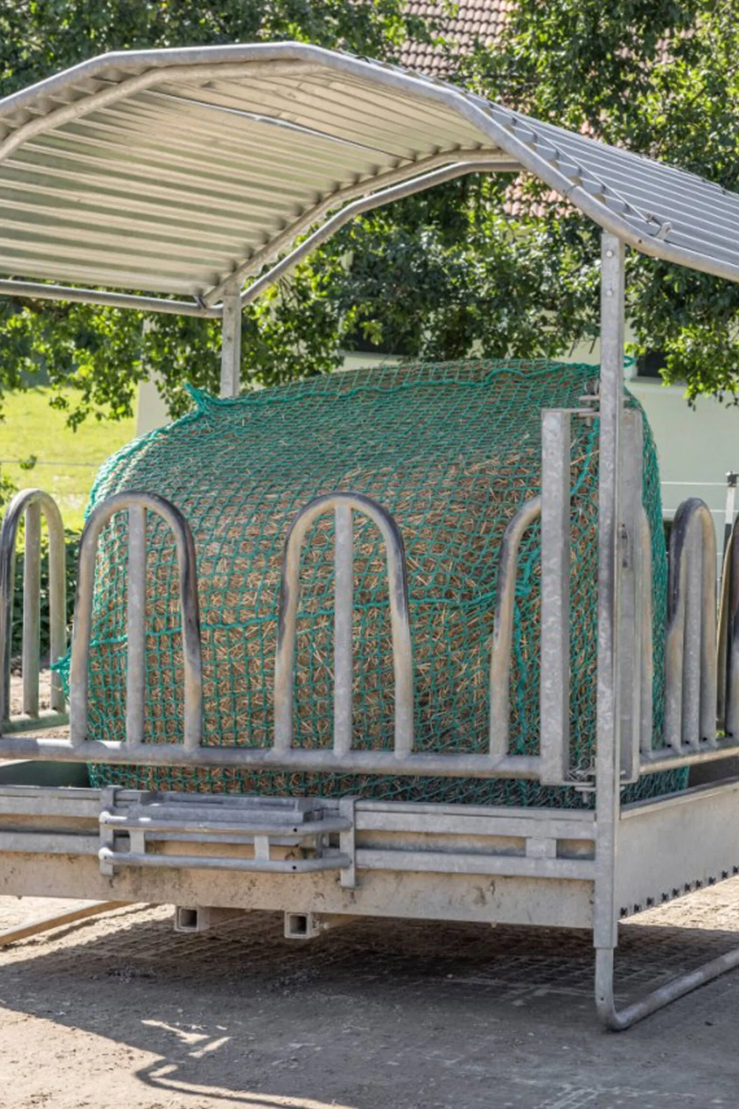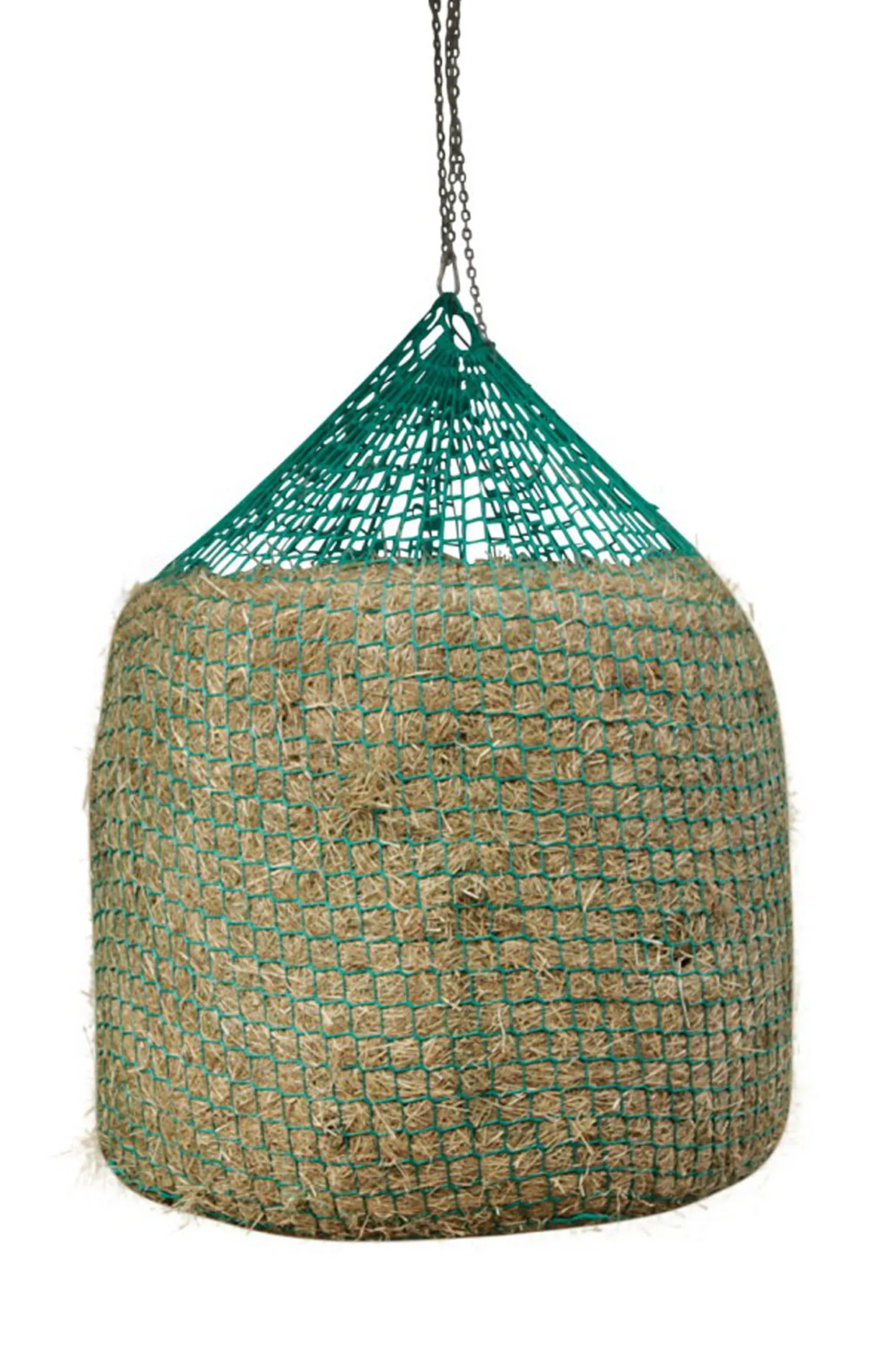 Hengende fôrnett for høy- og siloballer for fôrbesparende grovfôrsforsyning til hester.