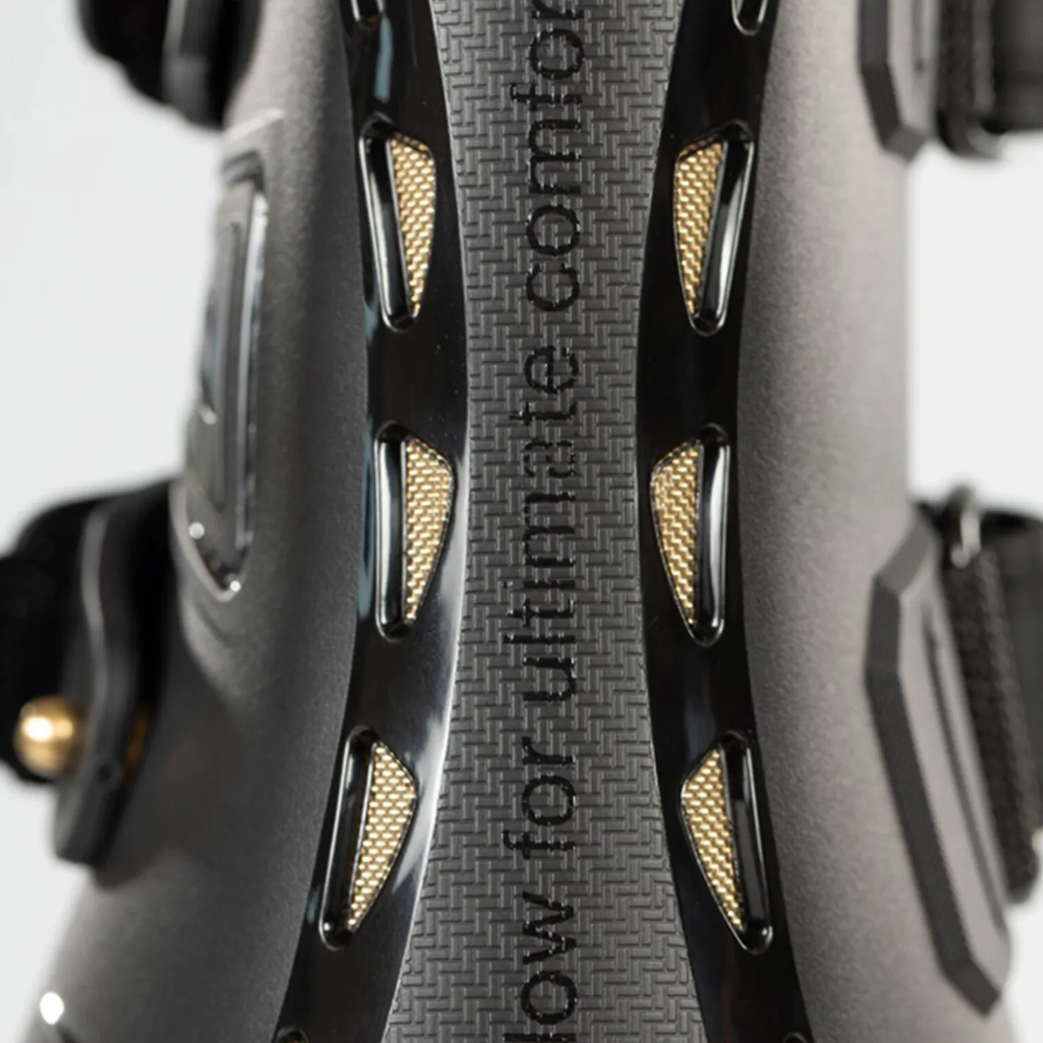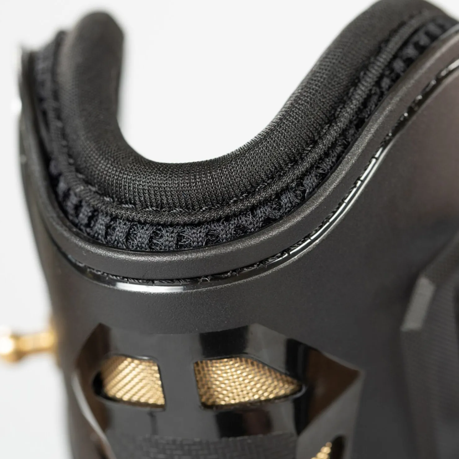 Støtdempende materiale rundt baksiden av senen for å minimere effekten av et slag.Welltex som forbedrer blodsirkulasjonen og støtter sener og ledd.Air-tech for maksimale pusteegenskaper.3D mesh teknologi for pusteegenskaper og styrke, sammen med innovativt, perforert, støtabsorberende skum.Ventilasjonshull langs senen og på siden.Solide stropper med borrelåslukking for at de skal sitte god, og for god individuell passform.Stroppene kan også kjøpes separat.