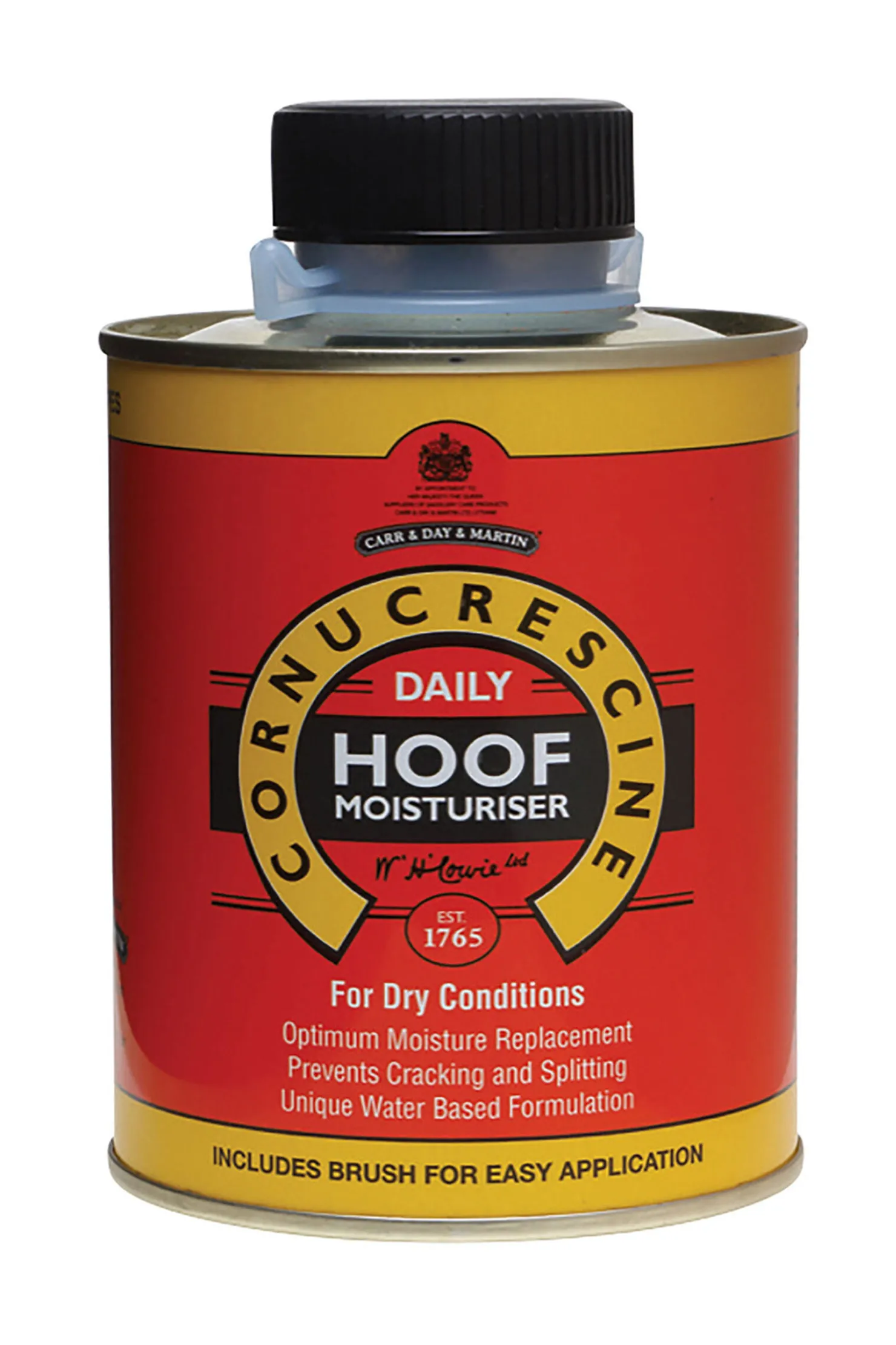 Carr Day Martin Cornucrescine Moisturiser with brush. Primarily for use in dry conditions, the Advanced, water-based formulation penetrates deep into the hoof horn to aid moisture replacement. If used on a daily basis this product maintains the optimum hoof moisture. Contains an integral, quality brush for easy application.
