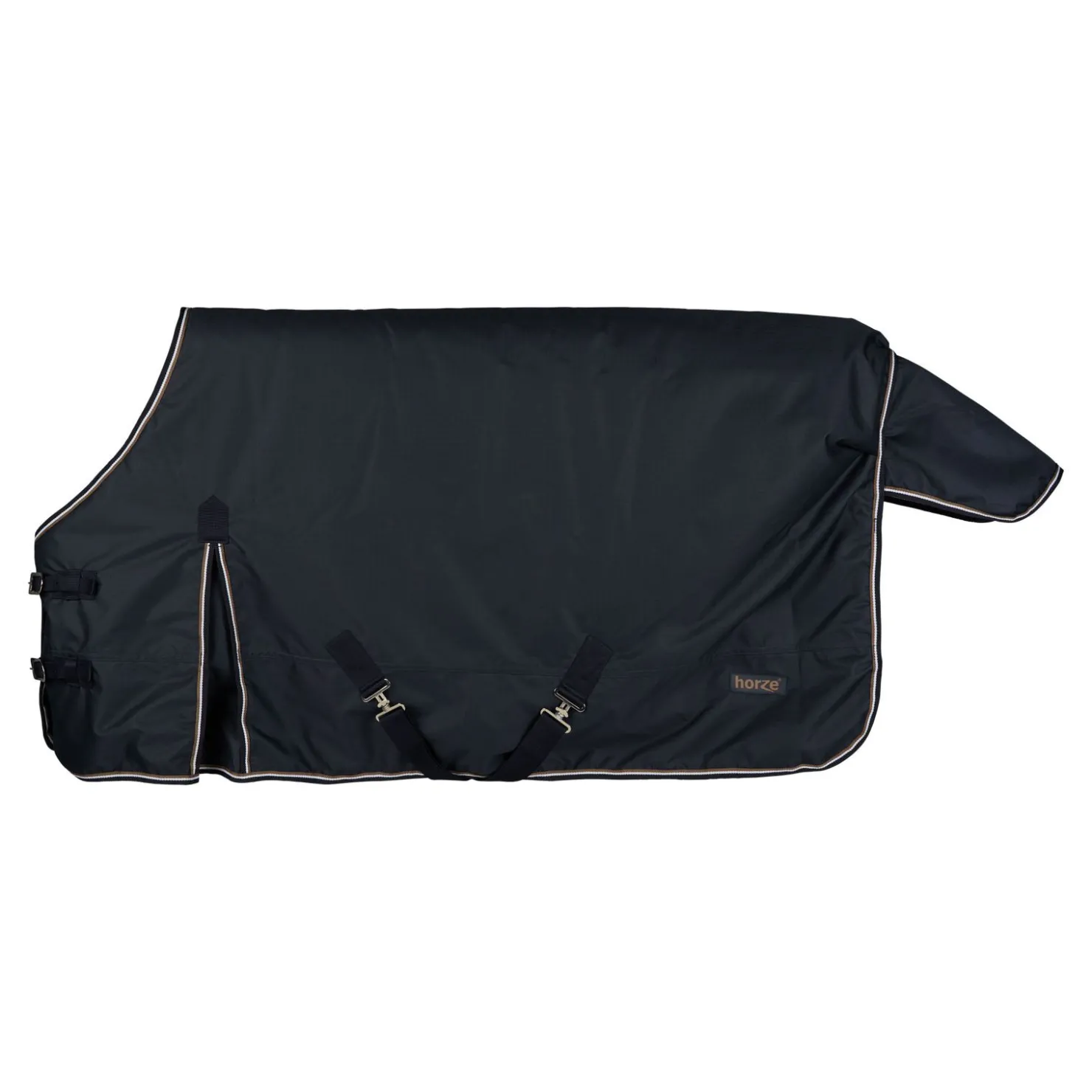 Dette dekkenet er laget av vanntett, pustende stoff.Den gode passformen ved halsen og skuldrene gjør det komfortabelt, og de høye bogsplittene gir mye bevegelsesfrihet.Frontspennene, kryssgjordene, beinsnorene og haleflappen gjør at dekkenet ligger sikkert på hesten .
