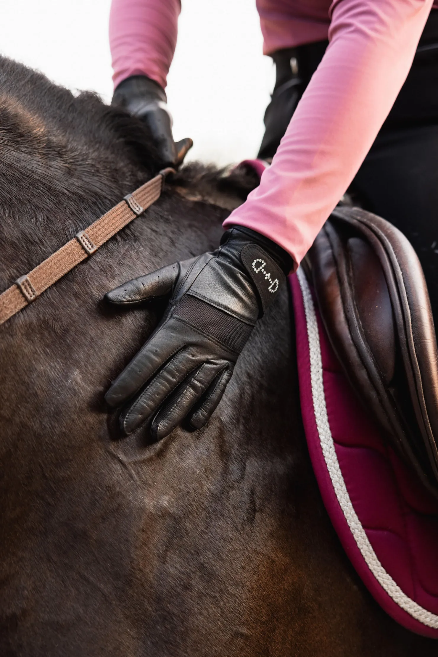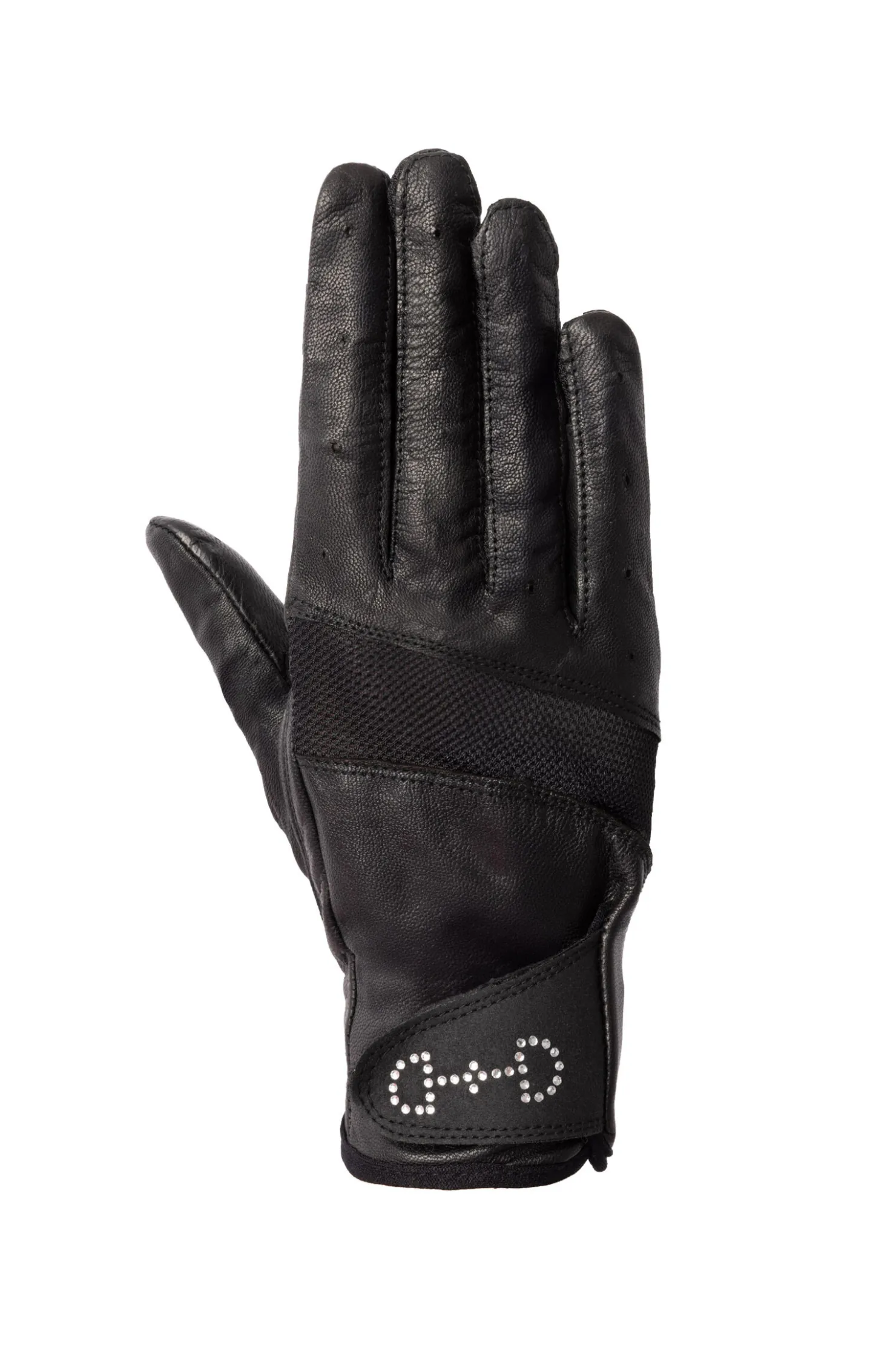 En liten D-ringstrinse i krystall er påført håndbaken på disse nydelige nettinghanskene, og gir et feminint utseende. Læret kommer med nettingpanel bak for ventilasjon på varme sommerdager. Disse hanskene vil forme seg etter hånden din og gi supert grep når du rir.