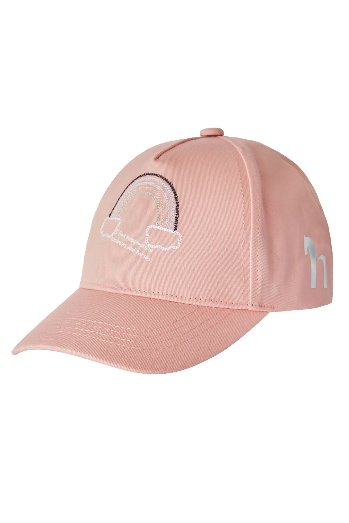 En fin beskyttelse mot sola, med supersøtt broderi foran, og en liten holografisk ‘h’ på siden.Det er brodert «I find happiness in rainbows and horses», og capsen er sydd i pastellfarger.