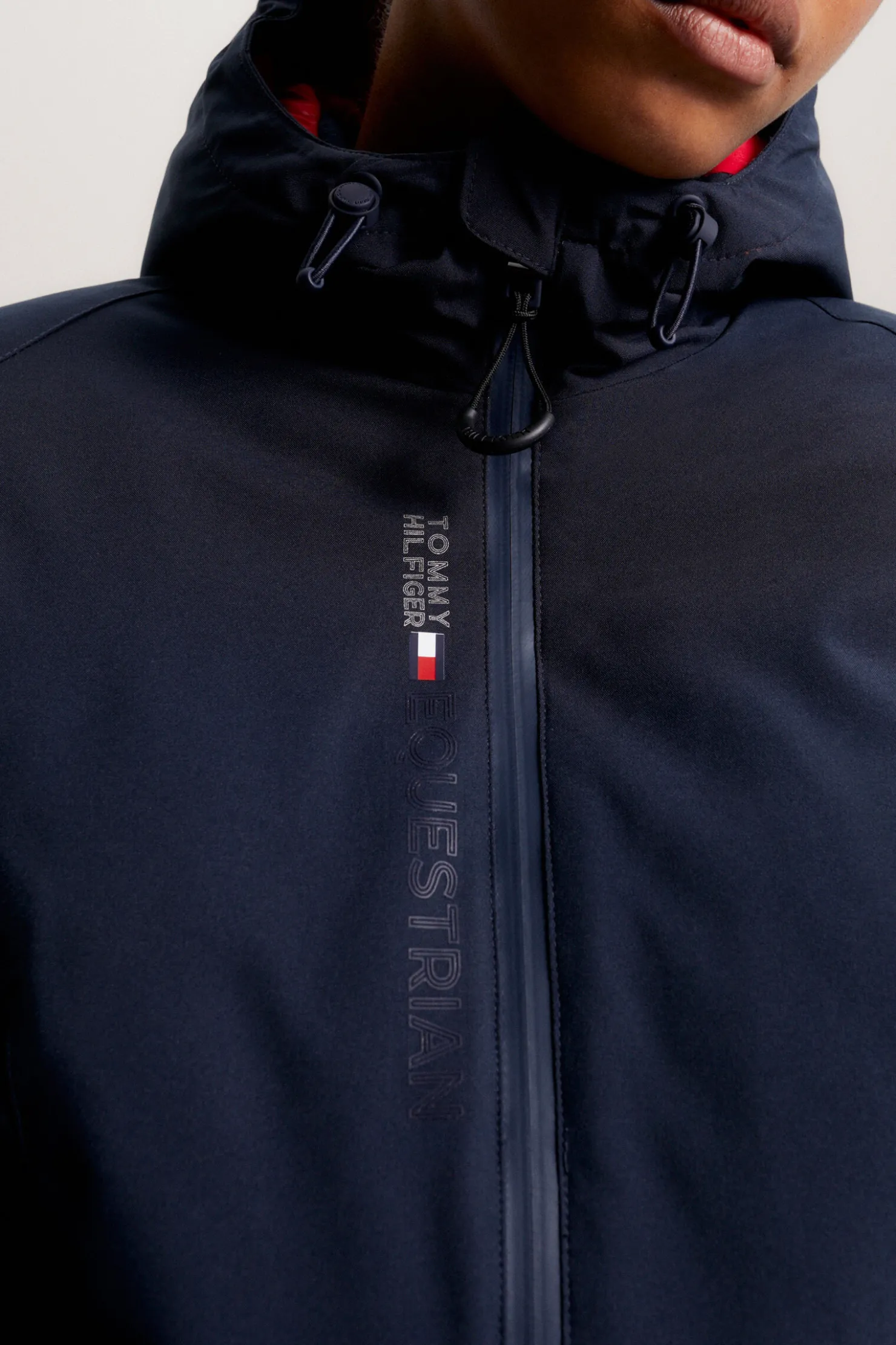 Denne varme og vindtette jakken, laget av et twillstoff, er laget av 100 % resirkulert polstring på innsiden for den mer bærekraftig bevisste rytteren. Denne jakken har så mange flotte funksjoner: reflekterende vanntett glidelås og sporty logotrykk midt på brystet, de to 2 glidelåslommene foran og på innsiden av jakken for ekstra oppbevaring, til metallknapper under hetten for å forhindre at den klaffer mens du sykler. . De funksjonelle trekksnorene i midjen lar rytteren lage en allsidig silhuett. Matcher London Horse and Rider Collection.