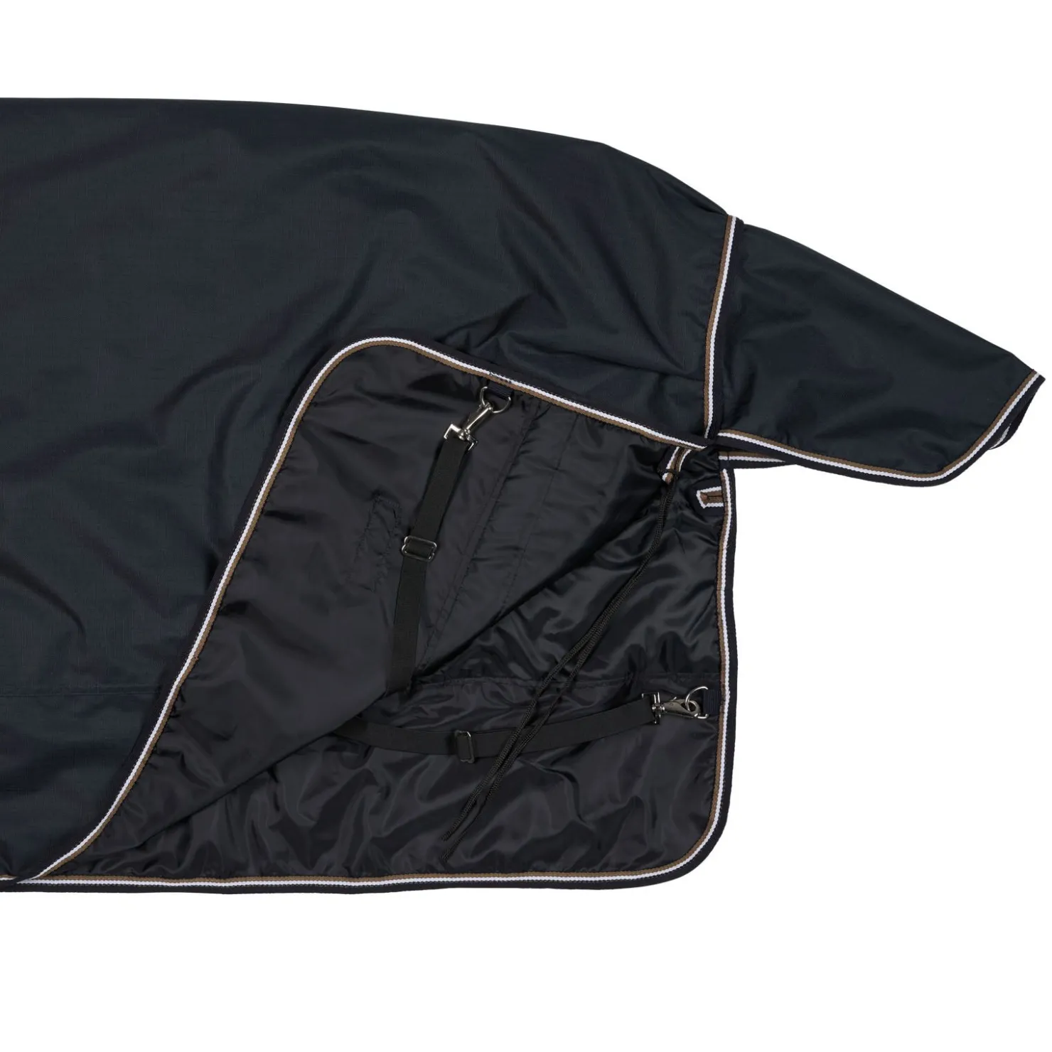 Dette dekkenet med hel hals er laget i et vanntett, pustende stoff.Den gode passformen ved halsen og skuldrene gjør det komfortabelt, og de høye bogsplittene gir mye bevegelsesfrihet.Frontspennene, kryssgjordene, beinsnorene og haleflappen gjør at dekkenet ligger sikkert på hesten .