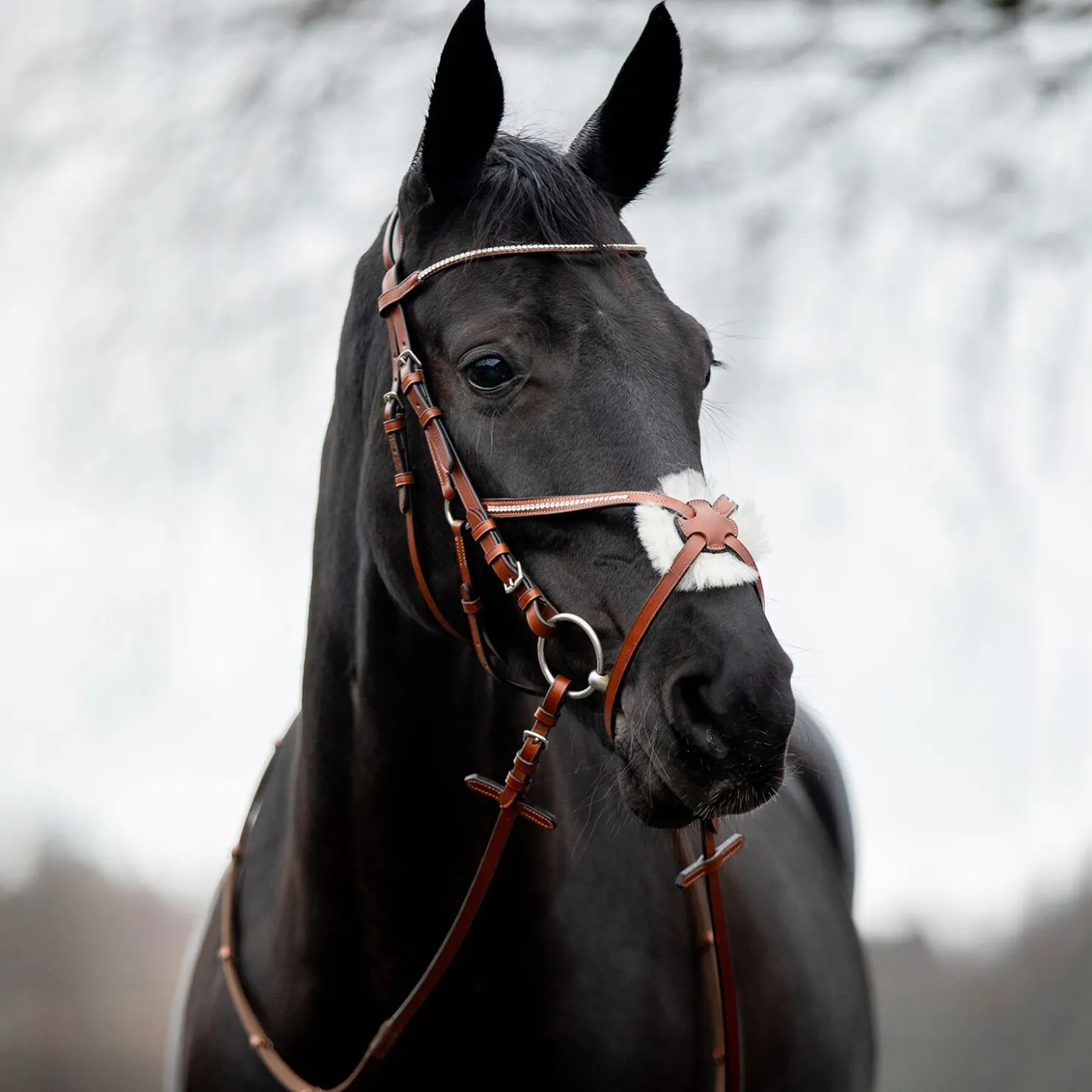 Horze Valencia hodelag med meksikansk nesereim er et klassisk valg for feltritt eller sprang, og denne kommer i en spesiell stil. Nesereimen i åttetallsfigur er utsmykket med krystaller som matcher det rette pannebåndet, og gir et helhetlig utseende. En myk plate fôret med ekte ull beskytter nesen, og du unngår gnag. Nyt dette elegante hodelaget med matchende tøyler.