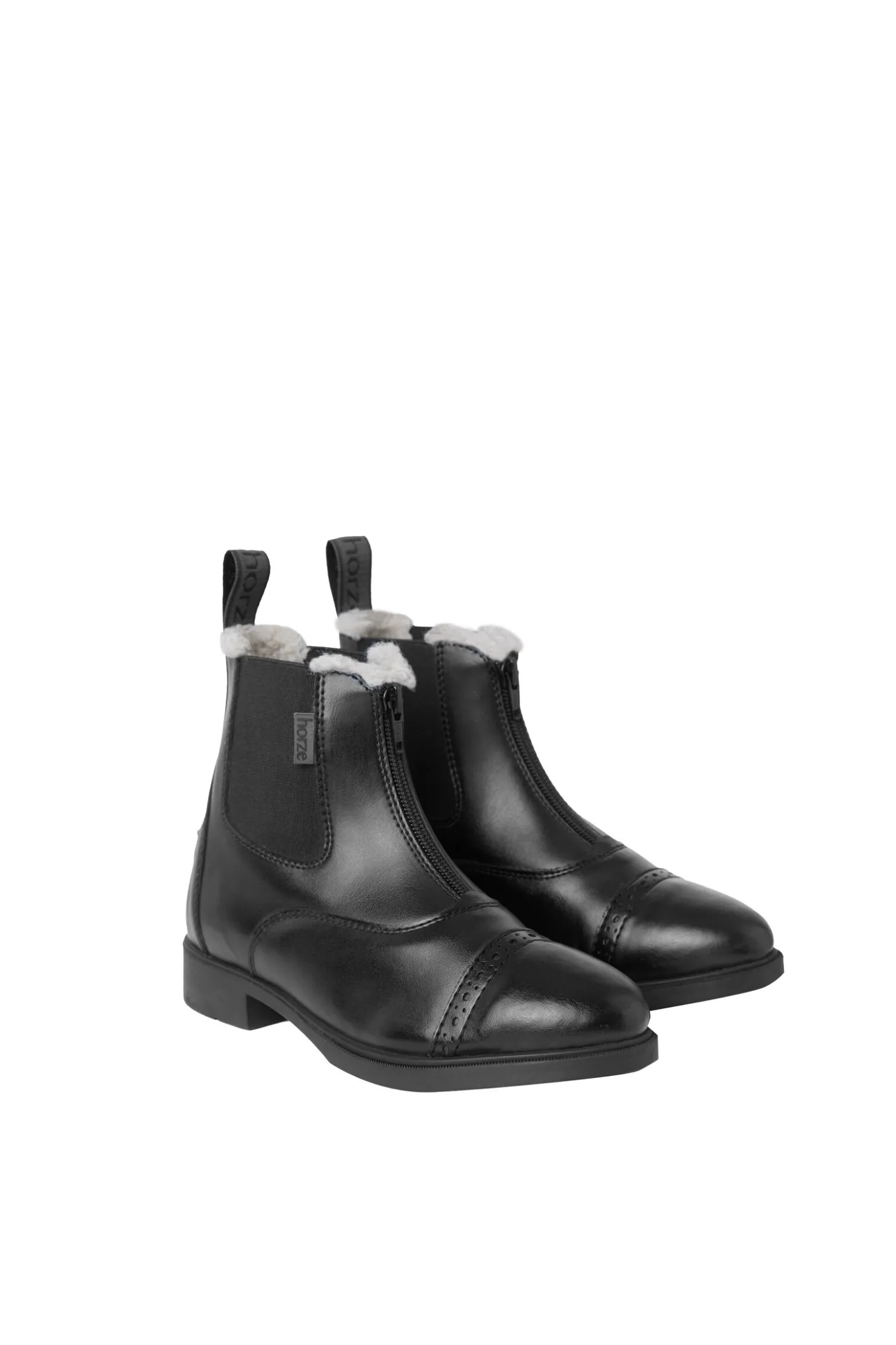 Disse jodhpurskoene har utseendet og følelsen til tradisjonelle stallsko, men har en rask glidelås foran, noe som gjør det enkelt for barn å ta dem på seg.Det gode håndverket kombinerer kvalitet og en klassisk stil.Det myke, syntetiske lærlignende materialet er lett å ta vare på, og ser alltid nytt ut.Fuskepels holder føttene til den lille rytteren varme.Disse skoene kommer til en rimelig pris for bruk i både stallen og til ridning, med en kvalitet som vil vare.