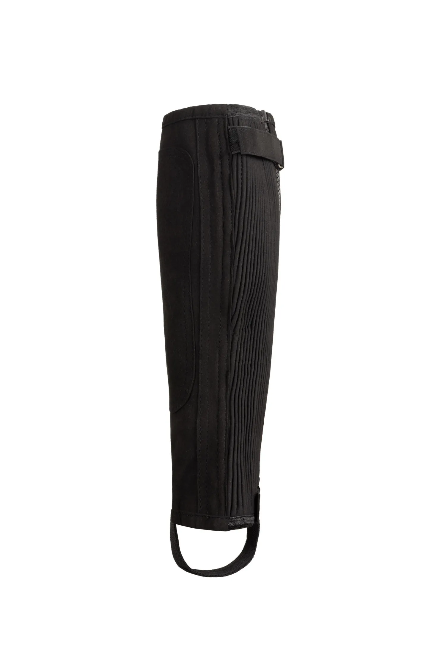 Horze har lagt vekt på detaljer i produksjonen av disse leggchapsene, for å være sikker på at stoffet er slitesterkt, holdbart og komfortabelt. Det naturlige Amara lærlignende produktet har lik struktur til ekte lær, men er helt syntetisk. Mikrofiberstrukturen er myk, holdbar og riftsikker med en styrke som bevarer fasongen og tåler røff bruk. Disse leggchapsene former seg naturlig rundt leggen. En holdbar YKK glidelås er plassert mellom strikkpanelene for å holde den på plass. På toppen er det en borrelås som justerer passformen, og en lapp over enden av glidelåsen for trykker den tett på plass. Det indre panelet beskytter mot gnag, og gir et godt grep selv ved våte forhold.