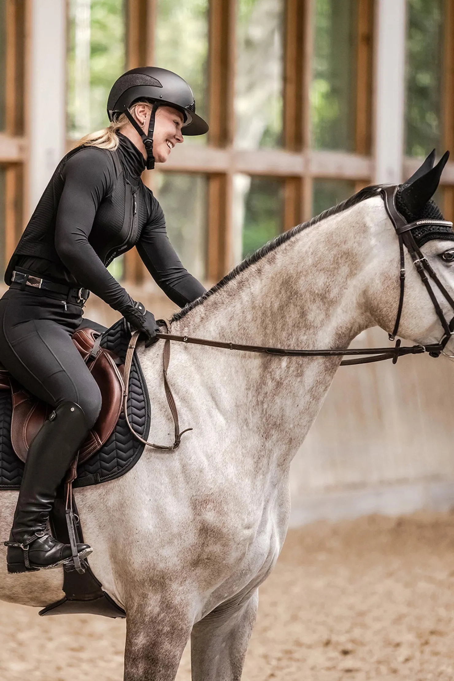 Utviklet i samsvar med gjeldende sikkerhetsstandard EN 1621-2:2014, Level 2, gir Swing P24 Flex enestående beskyttelse under ridning. Dets 5-lags Swing-Flex beskyttelsespanel i ryggområdet er imponerende slankt med bare 18 mm tykkelse, som gir maksimal bevegelsesfrihet uten å kompromittere sikkerheten. Den forbedrede ergonomiske utformingen og den automatiske breddejusteringen med Flex Jersey sikrer en perfekt passform som tilpasser seg optimalt til kroppen. Beskytterens elastiske, lette og pustende stoff garanterer maksimal komfort, slik at ryttere kan fokusere fullt ut på ytelsen sin. Frontglidelåsen med Swing Safety Puller muliggjør enkel åpning og lukking, selv i nødsituasjoner eller når man bruker hansker. Den høykvalitets CMZ-glidelåsen sørger for enkel på- og avkledning. For ekstra funksjonalitet er beskytteren i ryggområdet avtagbar, noe som gjør rengjøring og vedlikehold enklere. Silikonbåndet ved kanten forhindrer effektivt beskytteren i å gli opp under ridning og holder den på plass. Swing Ryggbeskytter P24 Flex er det perfekte valget for ryttere som setter pris på maksimal beskyttelse og uovertruffen komfort. Opplev friheten ved ridning med en beskytter som harmonisk kombinerer sikkerhet og fleksibilitet. Swing ryggbeskyttere beskytter kroppen din uten å redusere gleden ved ridning. Bruken av høyteknologiske materialer sikrer maksimal bevegelsesfrihet. Merk at for terreng- og feltrittprøver kreves en vest sertifisert til EN 13158 Level 3 i henhold til LPO-regelverket.