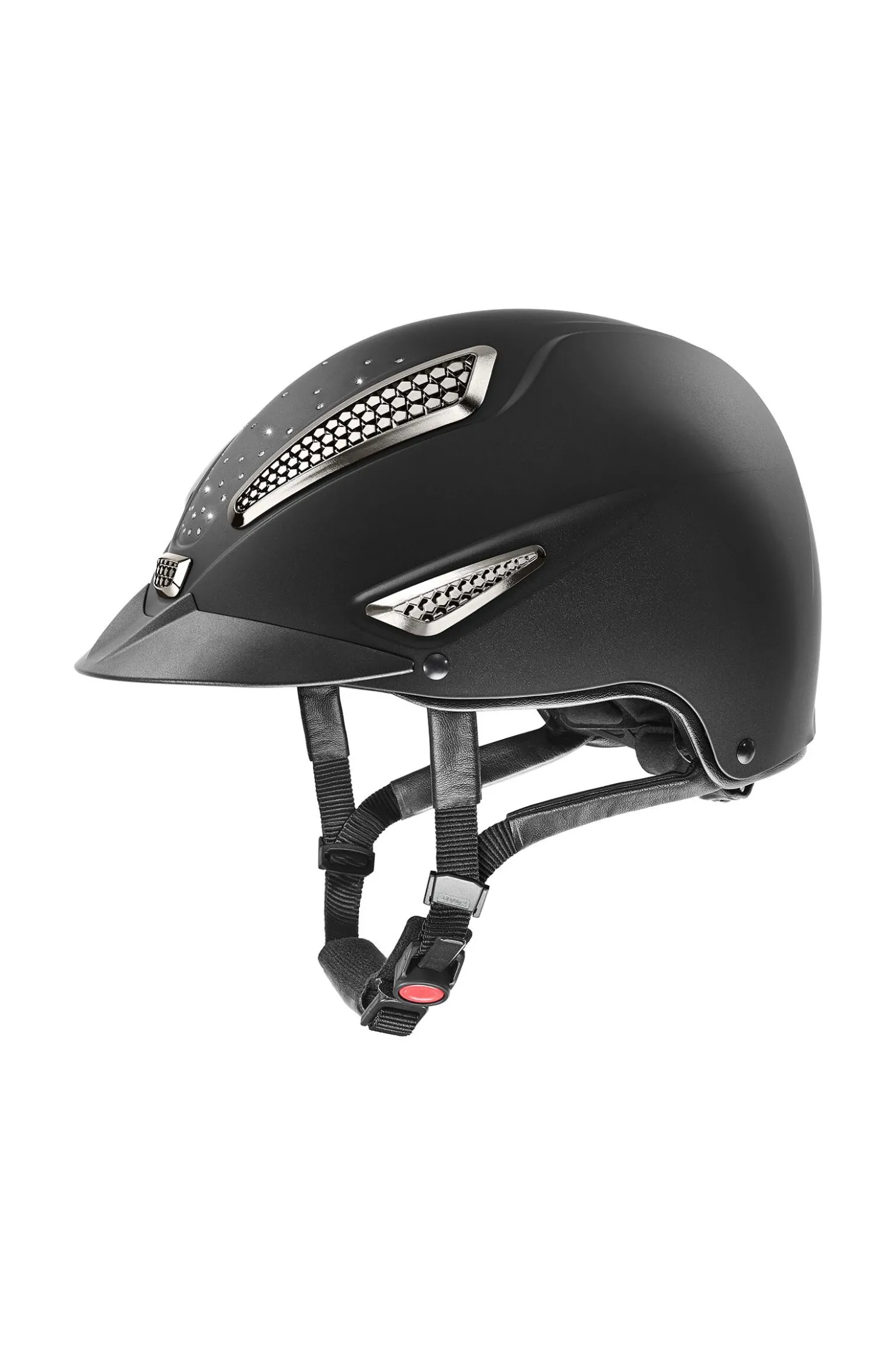 Premium stil møter topp ytelse. Uvex Perfexxion III Grace er et must-have for alle som finner understatement alt for kjedelig når de er i salen. For ditt fantastiske inntog er 38 originale Swarovski®-krystaller blitt satt inn for hånd, og de interagerer med de forkromede ventilasjonsgitter, luksuriøse remdeksler og kunstlærs piping. Dette gjør hjelmen til en eksklusiv blikkfang. For økt sikkerhet har Uvex Perfexxion III Grace en forlenget ytterskall bak på hodet. Det dynamiske ventilasjonssystemet sikrer optimal luftstrøm og garanterer et perfekt klima inne i hjelmen til enhver tid. Komfortfunksjoner fullføres med den praktiske ponytail-utskjæringen og den spesielt myke og pustende super-soft mikrosense-fôringen.