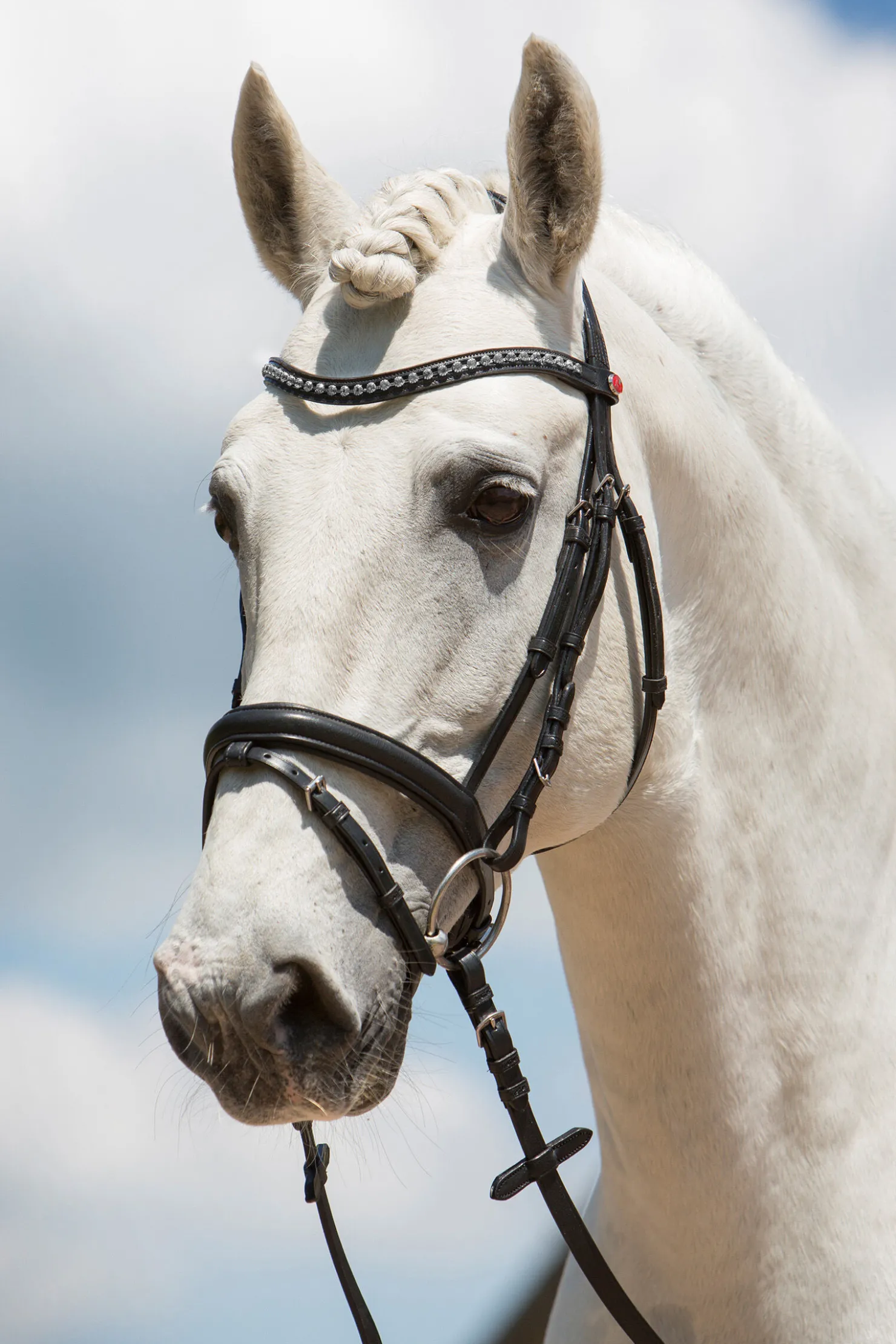 Hodelag i ekstremt mykt lær, med buet pannebånd med krystaller.