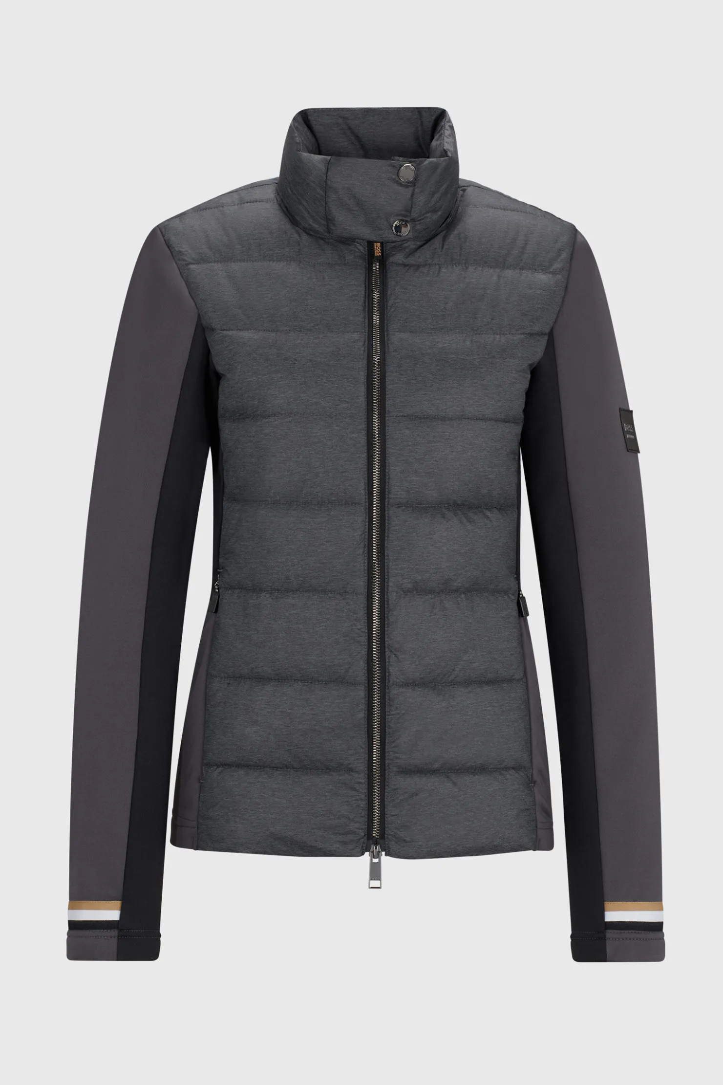 Lett 2. lags blanding av dunjakke og softshelljakke.Softshellfiber på ermene og sidepanelene, front og øvre rygg i dunfylt nylon.
