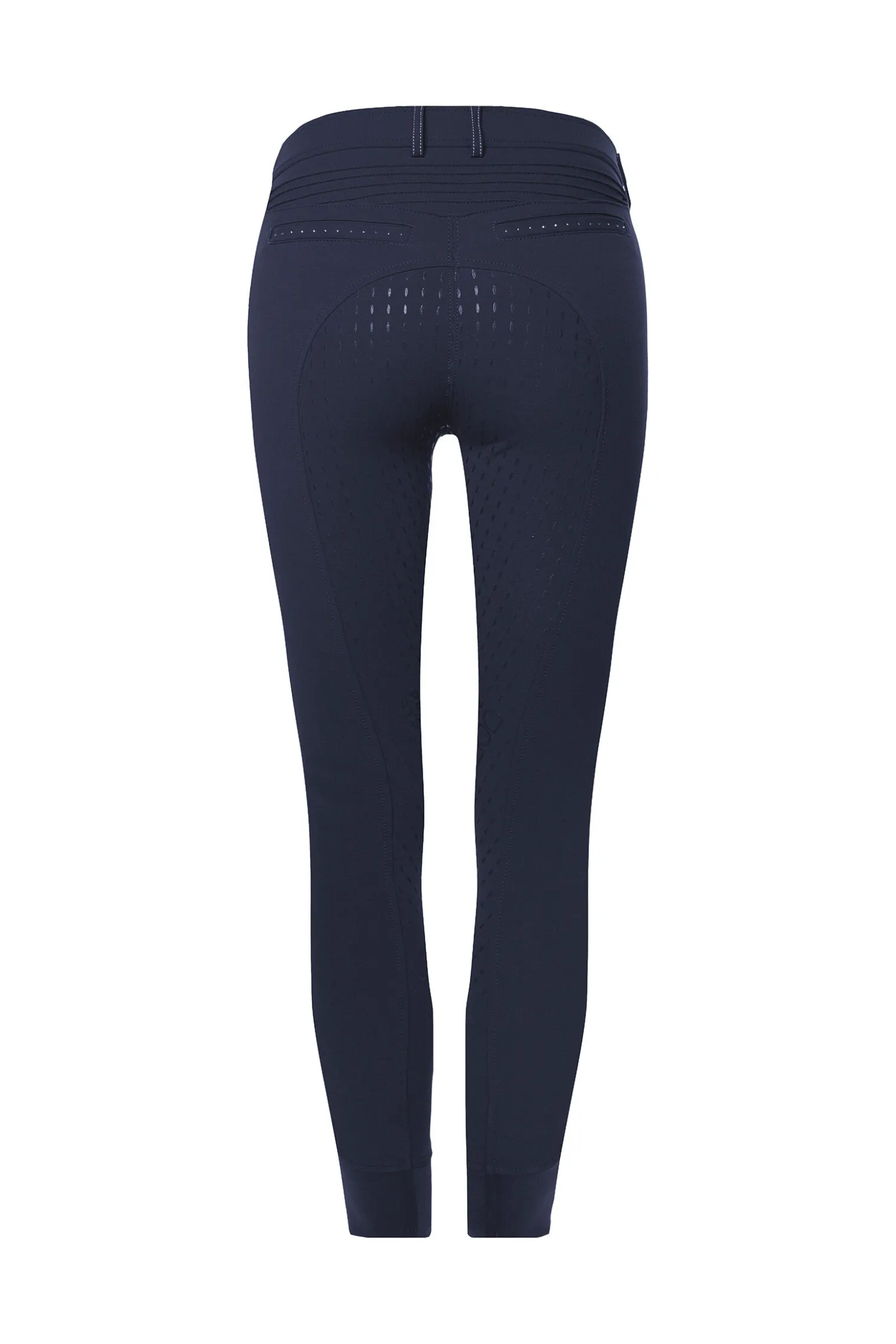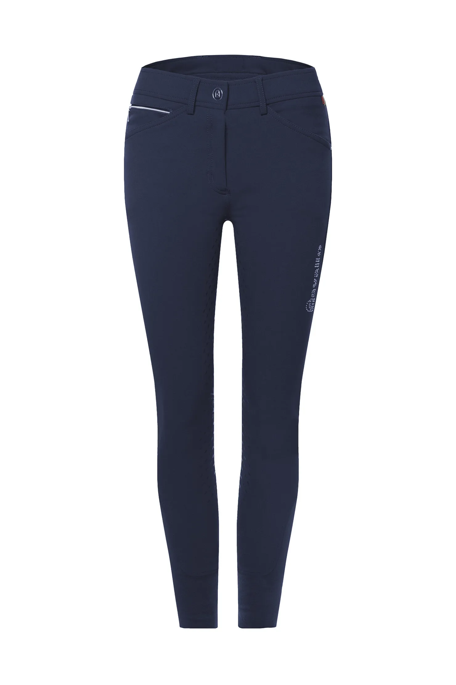 Sporty breeches with sparkling details. Two comfortable pockets at front, on right side additionally with subtle two coloured zip. Fake welt pocket on back and Cavallo logo made of sparkling cut metal nailheads. Through special construction seamless knee area. Worked in pin tucks on back pants ensure special fit of waistband. Extremely soft, perfectly gripping silicone grip.