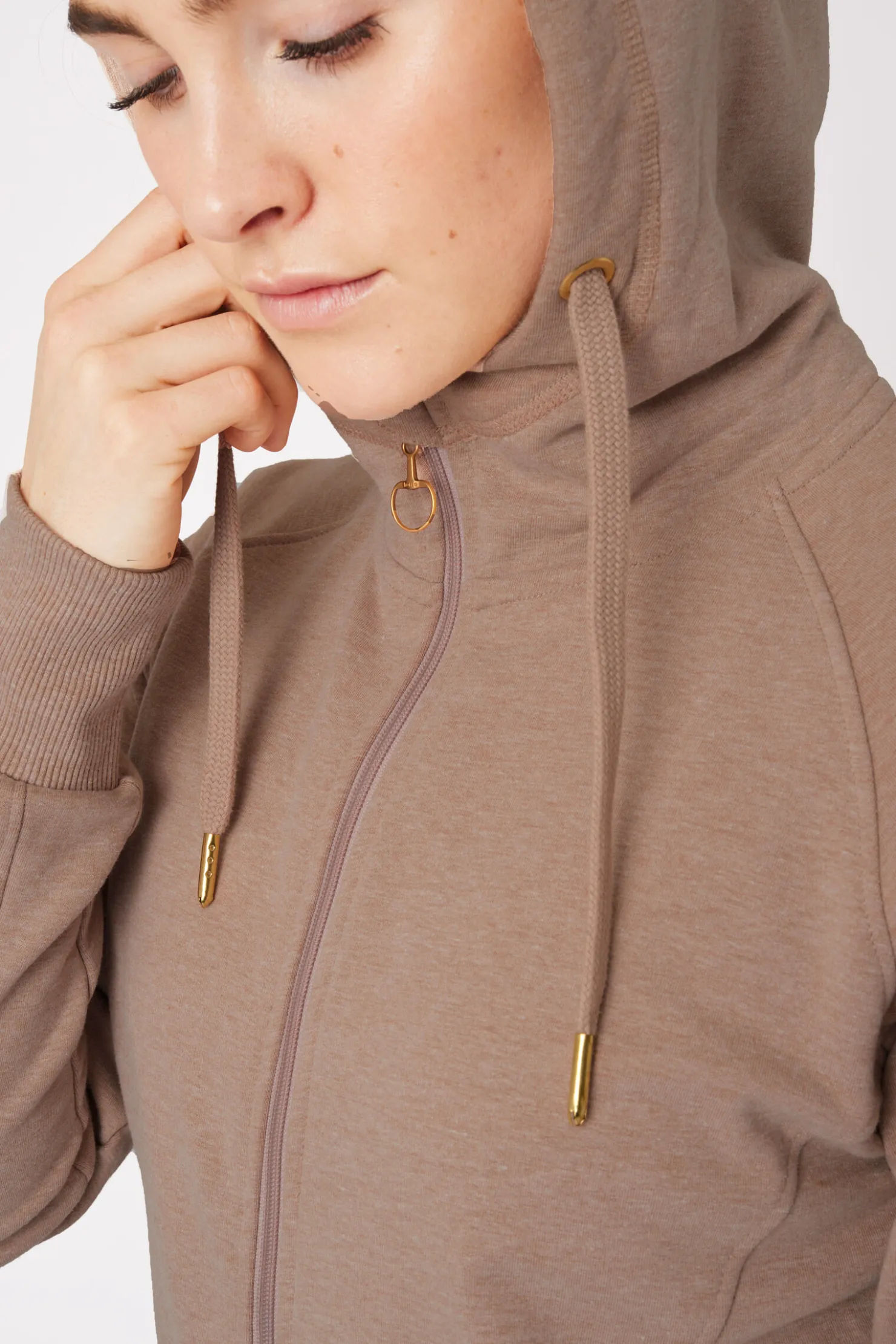 Laget av et mykt, elastisk stoff med børstet innside for ekstra varme og komfort. Dette er et perfekt tilskudd til høstgarderoben. Den praktiske toveis glidelåsen gjør denne jakken ekstra passende til ridning. Samtidig vil den passe utenfor stallen, takket være melange-stilen og jersey-stoffet i en viss kontrastfarge rundt kanten av hetten og på innsiden. Usynlige glidelåslommer holder eiendelene dine trygge.