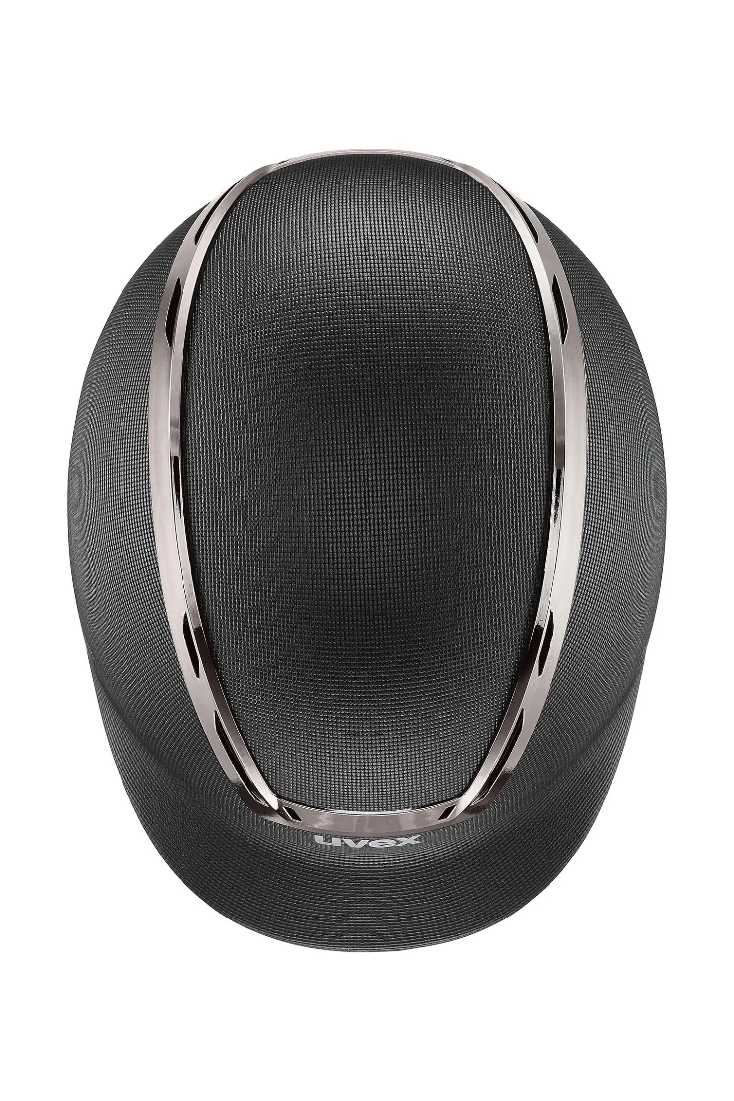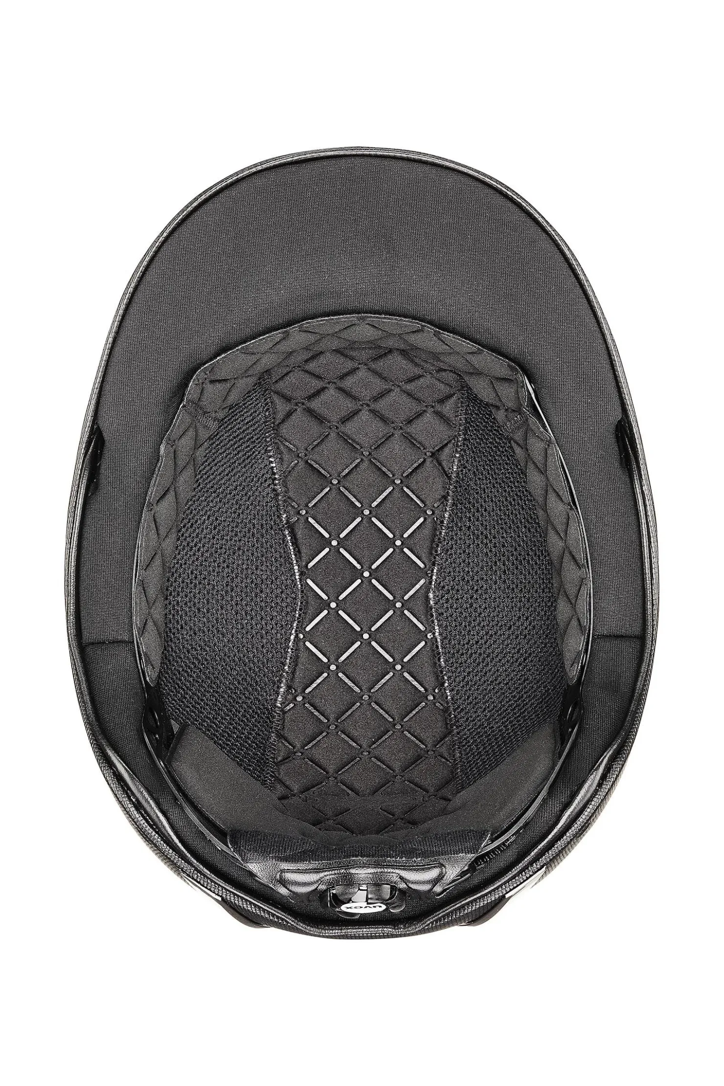 Denne hjelmen har mye å tilby 窶åde i utseende og funksjoner. Du vil elske det strukturerte veganske lærbelegget og den iøynefallende kromrammen i svart metall. Dette gjør den chic og fremhever den sporty stilen til denne ridehjelmen. Det rene utseendet kompletteres av vår nye justerbare Y-deler med veganske lærremmer. Resultatet: en høybeskyttende hjelm hvis hardshell-teknologi overholder de nyeste standardene samtidig som den sikrer optimal komfort. Chic og kul stil for store sportslige prestasjoner.