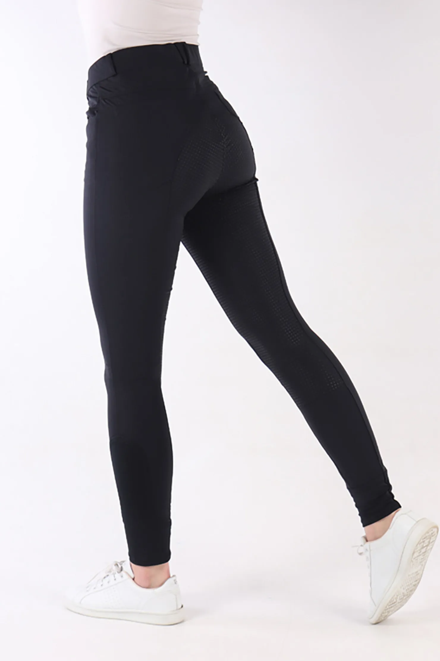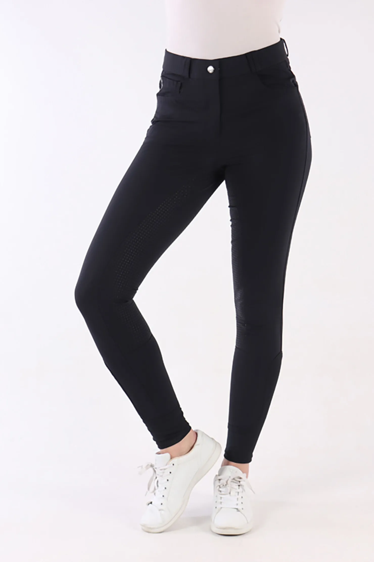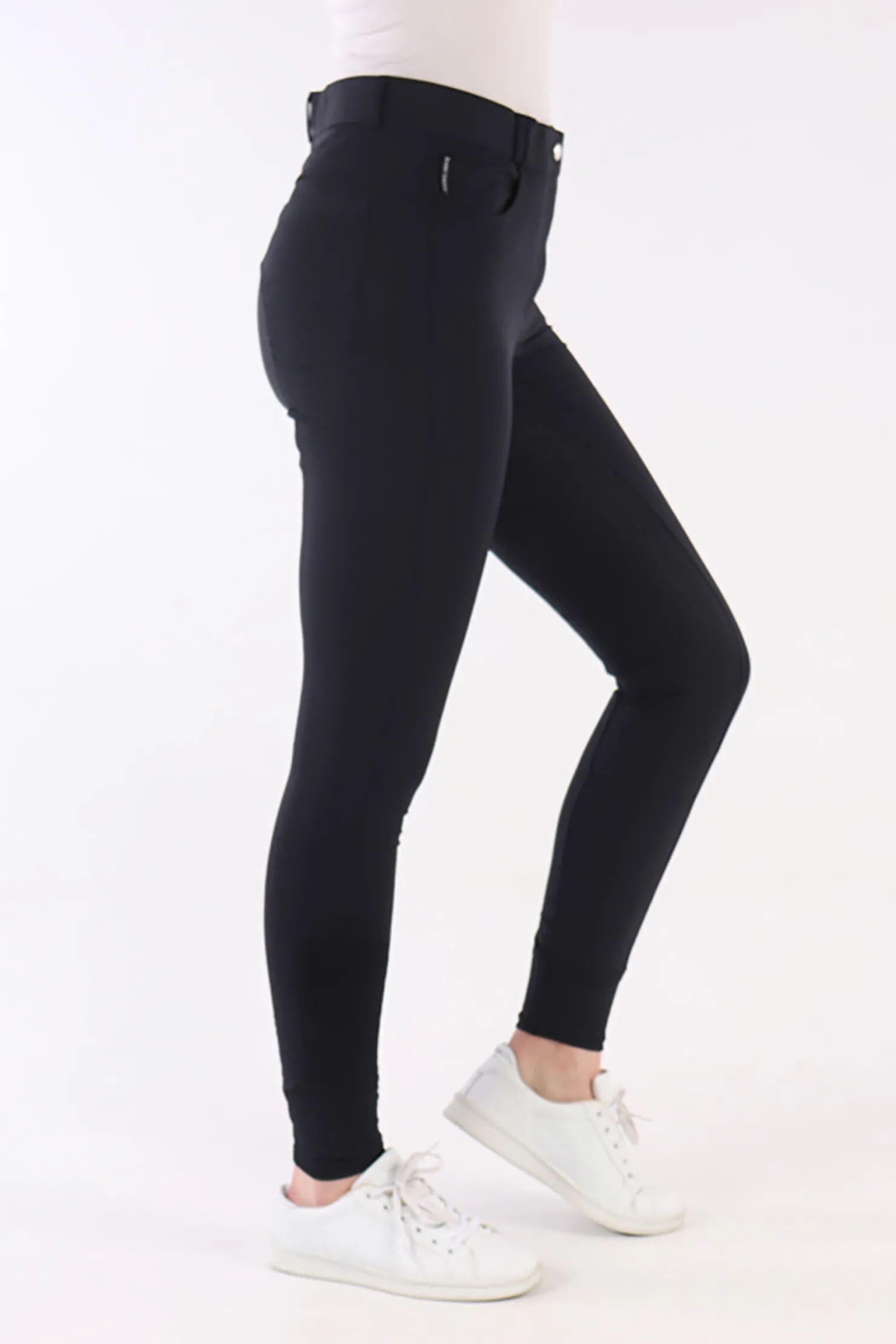 Breeches with round stitched, silicone print full seat for extra grip in the saddle, two back pockets, two slit pockets, and a clasp fastening and zip, Flex legs.