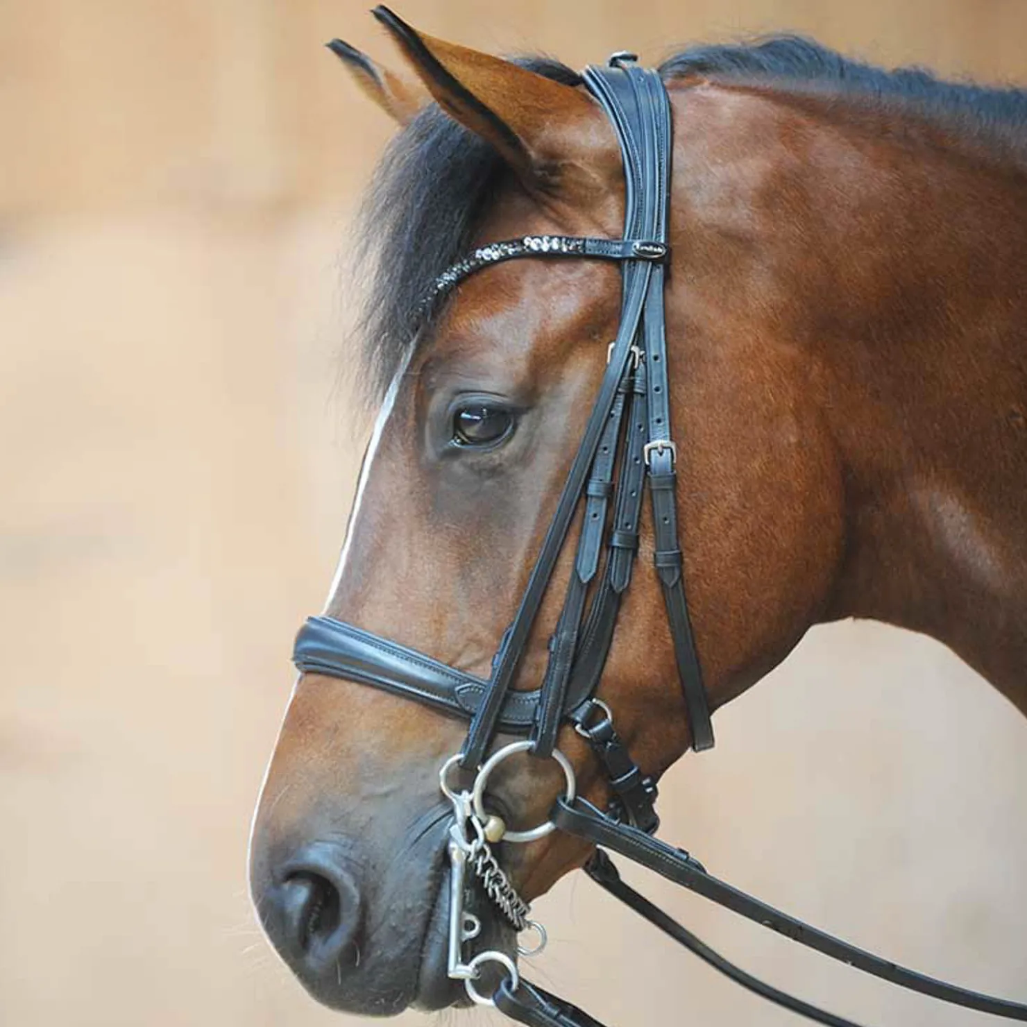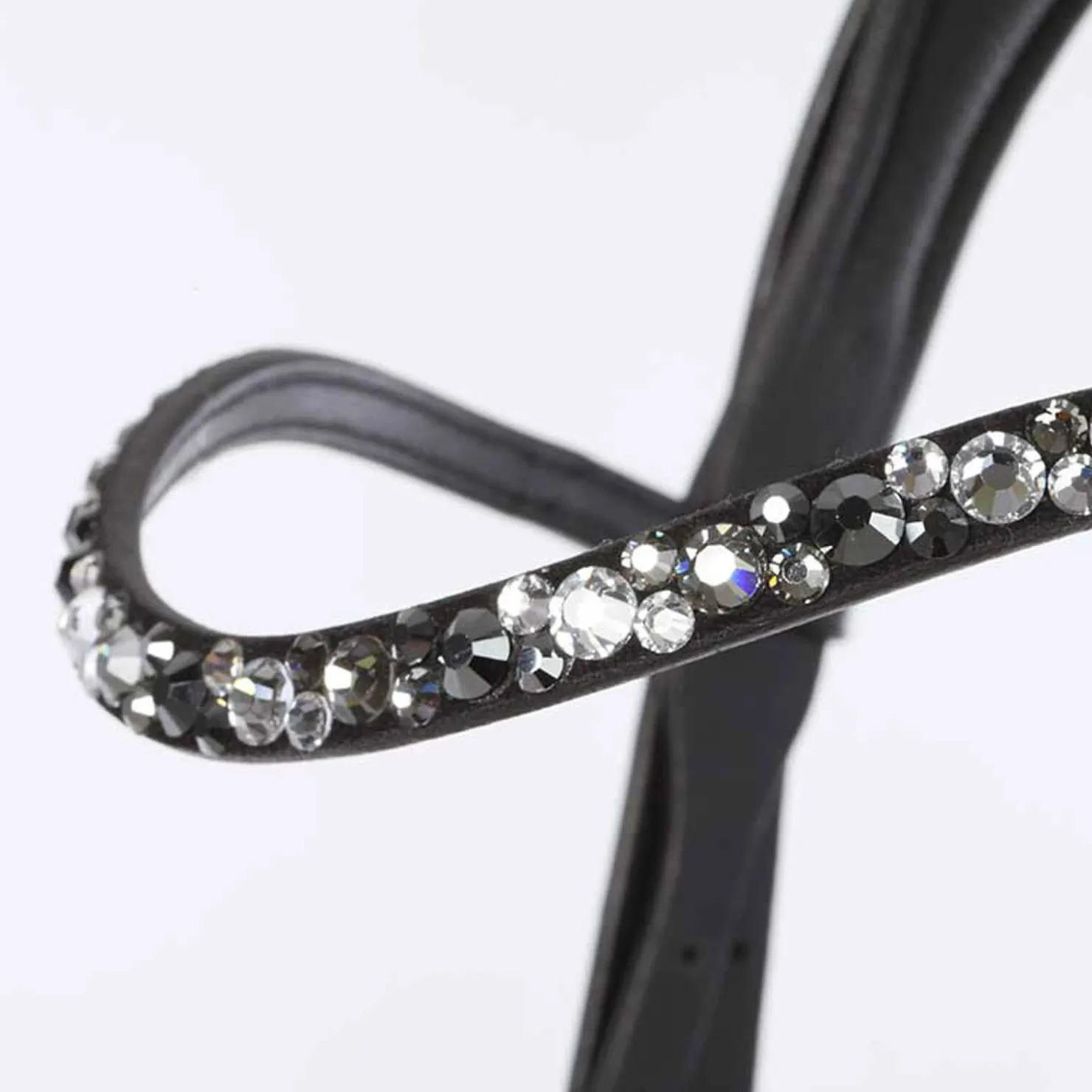 Et ekstremt praktisk kominasjonshodelag.Med elegant panneåbnd med hvite, grå og svarte steiner.Anatomisk formet engelsk nesereim med avtakbar flash-reim.Valgfrie, avtakbare kinnstykker så det kan kombineres til et kandarhodelag.Kombinasjonshodelaget kommer også med to par tøyler.En er normale kandartøyler uten stoppere, og de andre er tynne, gummidekte tøyler.
