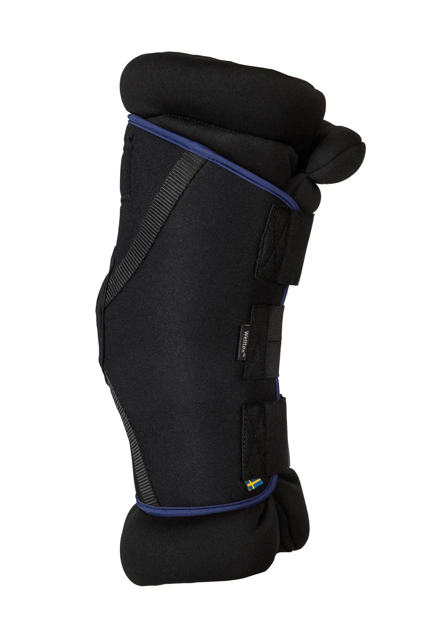Ny og oppdatert Deluxe-modell av Back on Track sine populære Royal hasebelegg!Hasebelegget består av to deler. Et robust og holdbart ytterskall, og en tykk innvendig polstring med Welltex®-teknologi.Beleggene kommer med tre sterke og holdbare borrelåsfester.Den midterste stroppen har et todelt, elastisk bånd for å unngå trykk på leddet.Hasebeleggene brukes når hesten hviler, er i stallen eller på transportModellen Royal Deluxe er anatomisk formet for å gi en optimal passform rundt hasespissen.Det utvendige skallet er velformet, med strategisk plasserte sømmer for å unngå trykkpunkter på hestens sensitive sener.Åpningen over hasespissen sikrer god fleksibilitet og en sikker passform.Den innvendige polstringen går høyt opp på beinet, og har en rund form for å gi best mulig komfort.Polstringen kan lett fjernes når du vasker beleggene, ettersom de festes til den utvendige delen med borrelås.Den innvendige polstringen er innsatt med Welltex®-tenologi.Materialet reflekterer kroppsvarme i form av fjerninfrarød energi.Den kan stimulere blodsirkulasjonen i området den brukes, og lindre problemer med stivhet, betennelse og artrose.