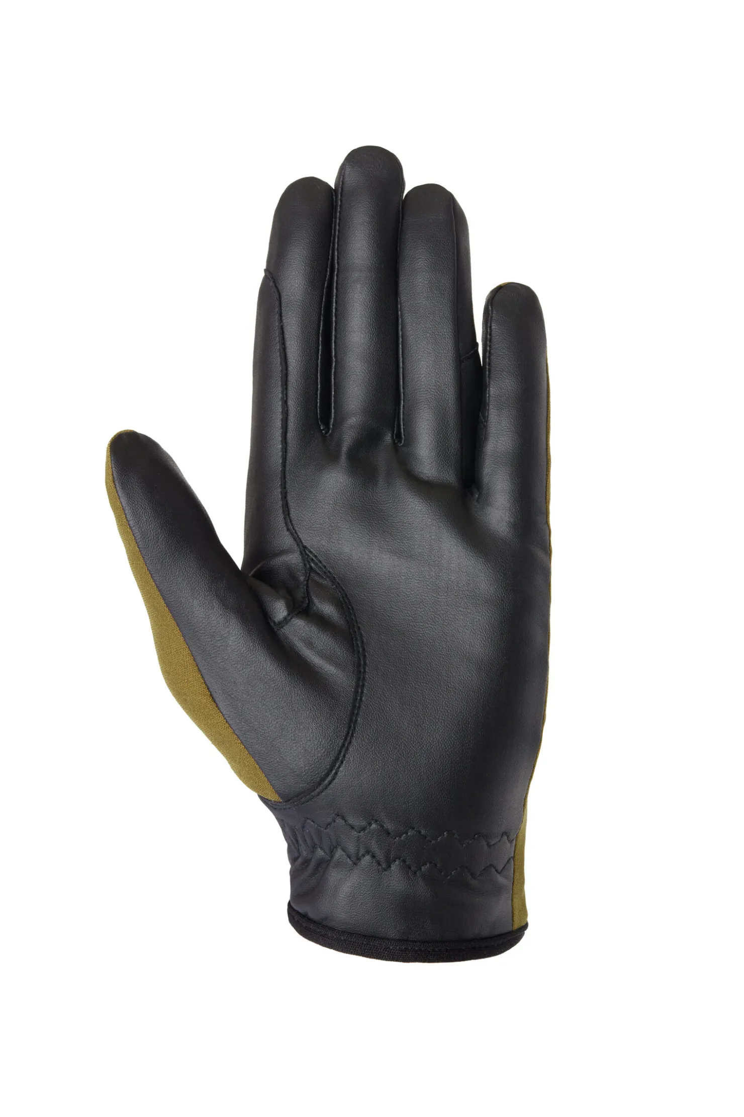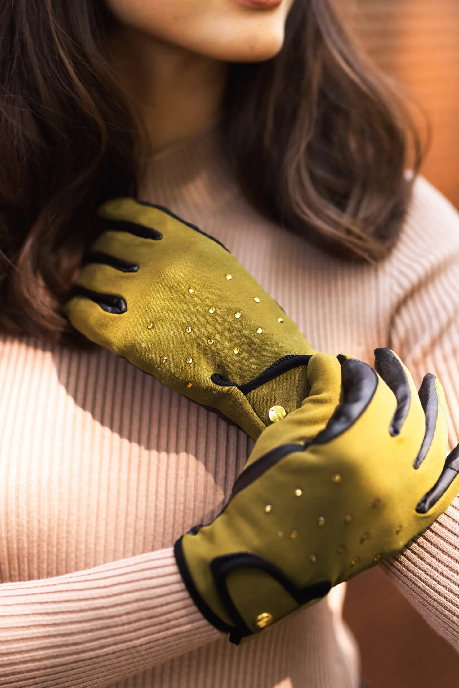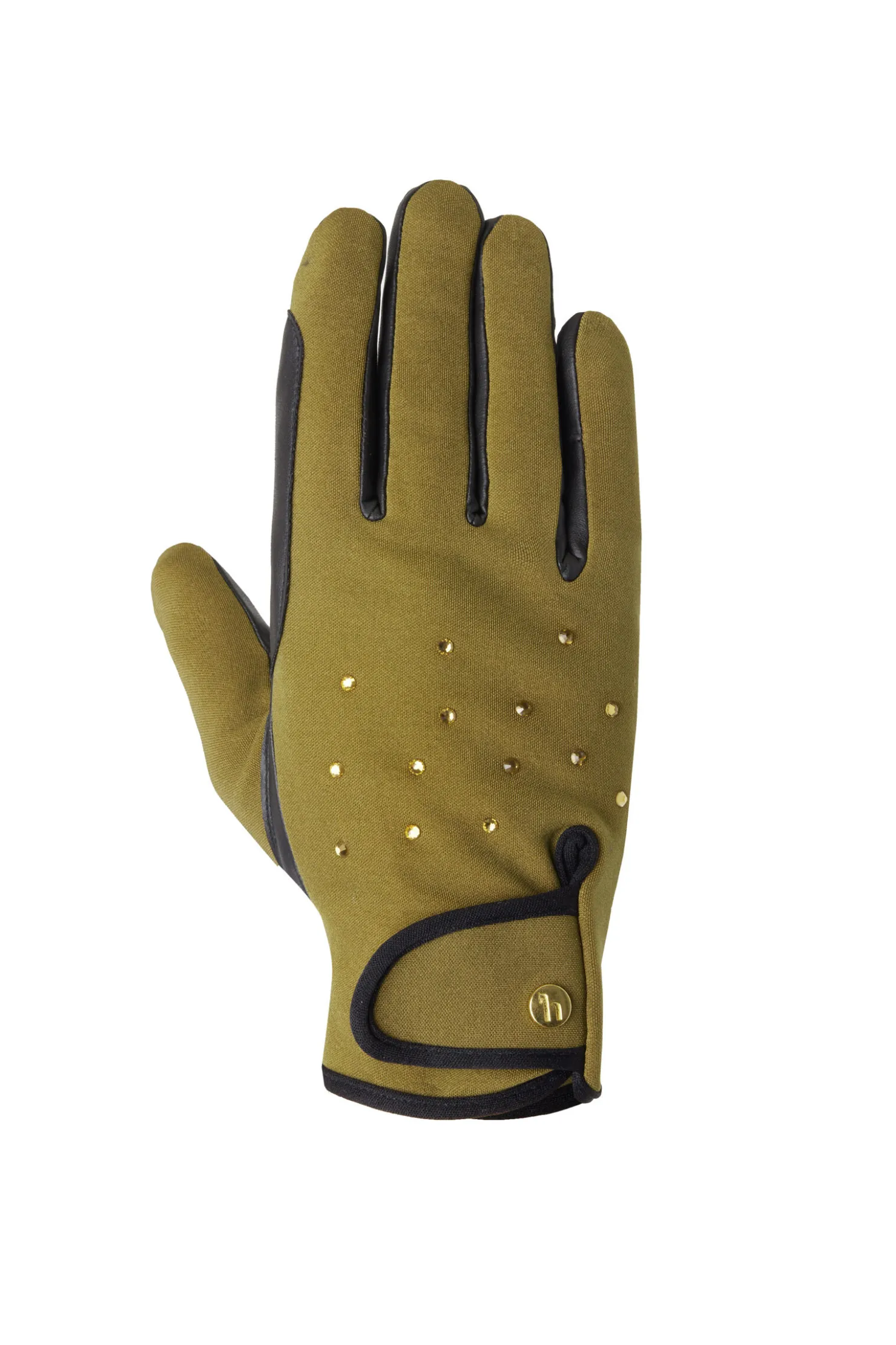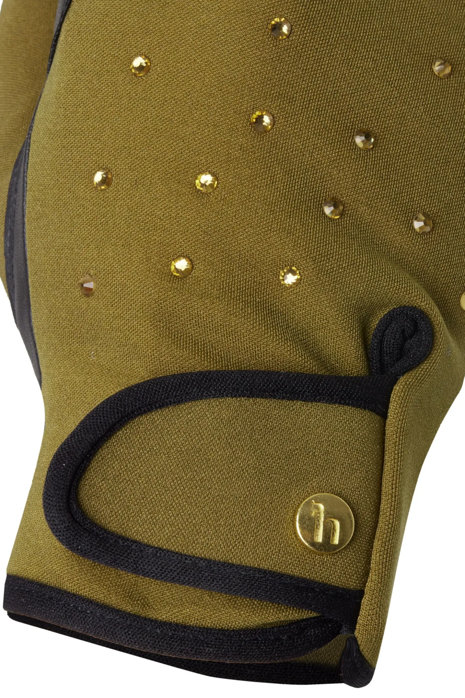 Elegante vinterhansker med varmt fleecefôr og gripende stoff i hele håndflaten. Tøyleforsterkere øker holdbarheten, mens bronsefargede pyntesteiner på håndbaken er en glitrende detalj til ditt vinterantrekk.