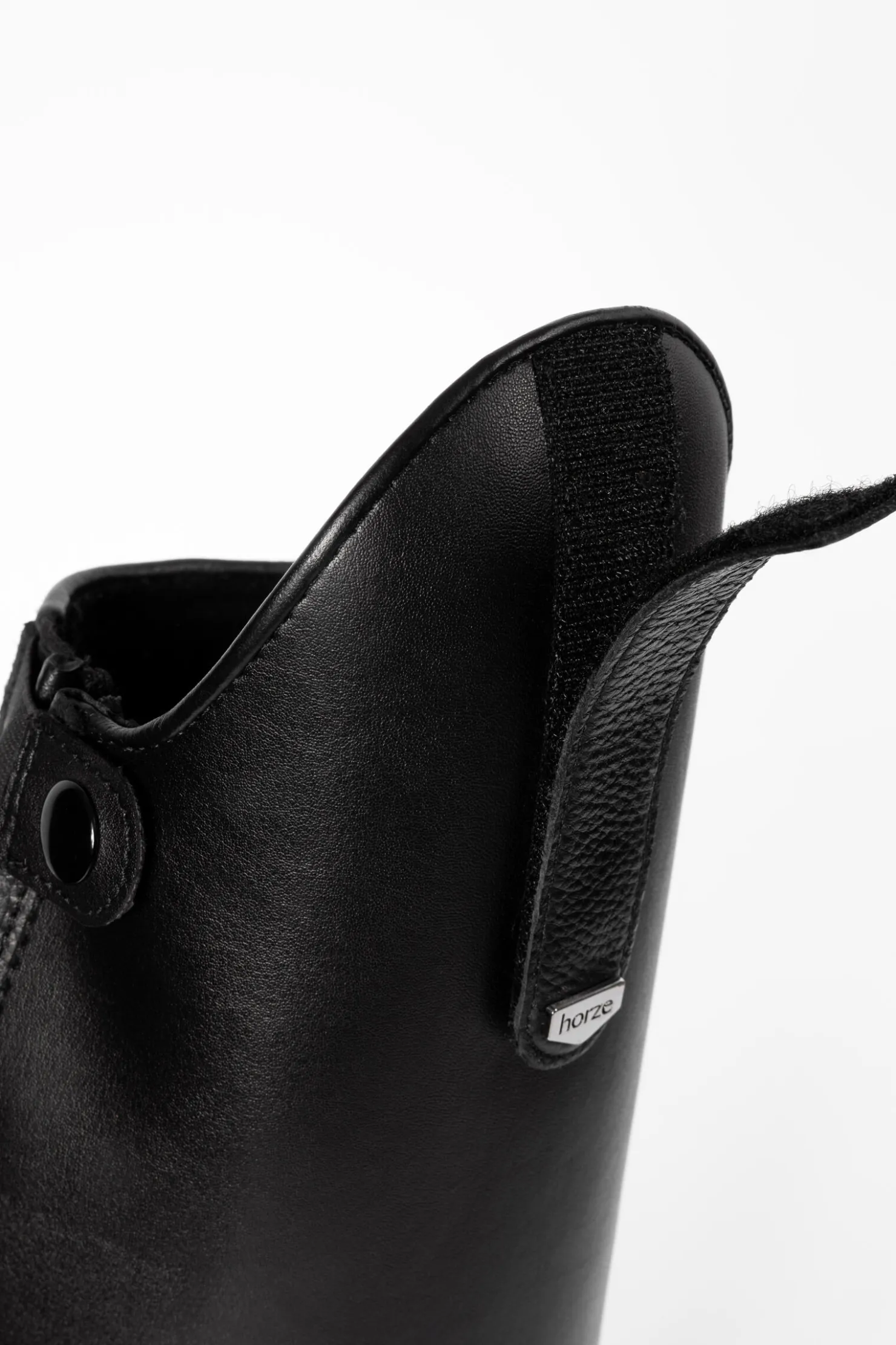 Vår Verona ridestøvler er både elegante og praktiske – perfekt for stevner når du trenger å ta deg best mulig ut. Begge de avtakbare kantene kommer med en liten sølvnål med Horze-logoen. Kombinert mykt lær på utsiden, og et preget område med lær på innsiden for en svært profesjonell ridestøvel. Det elastiske panelet som er langs hele høyden gir en tett passform. Foten har stemplede detaljer, fikserte elastiske lisser og praktiske støtter til sporene. En lærstropp med trykknapp på toppen og bunnen av glidelåsen sikrer at den ikke åpner seg.