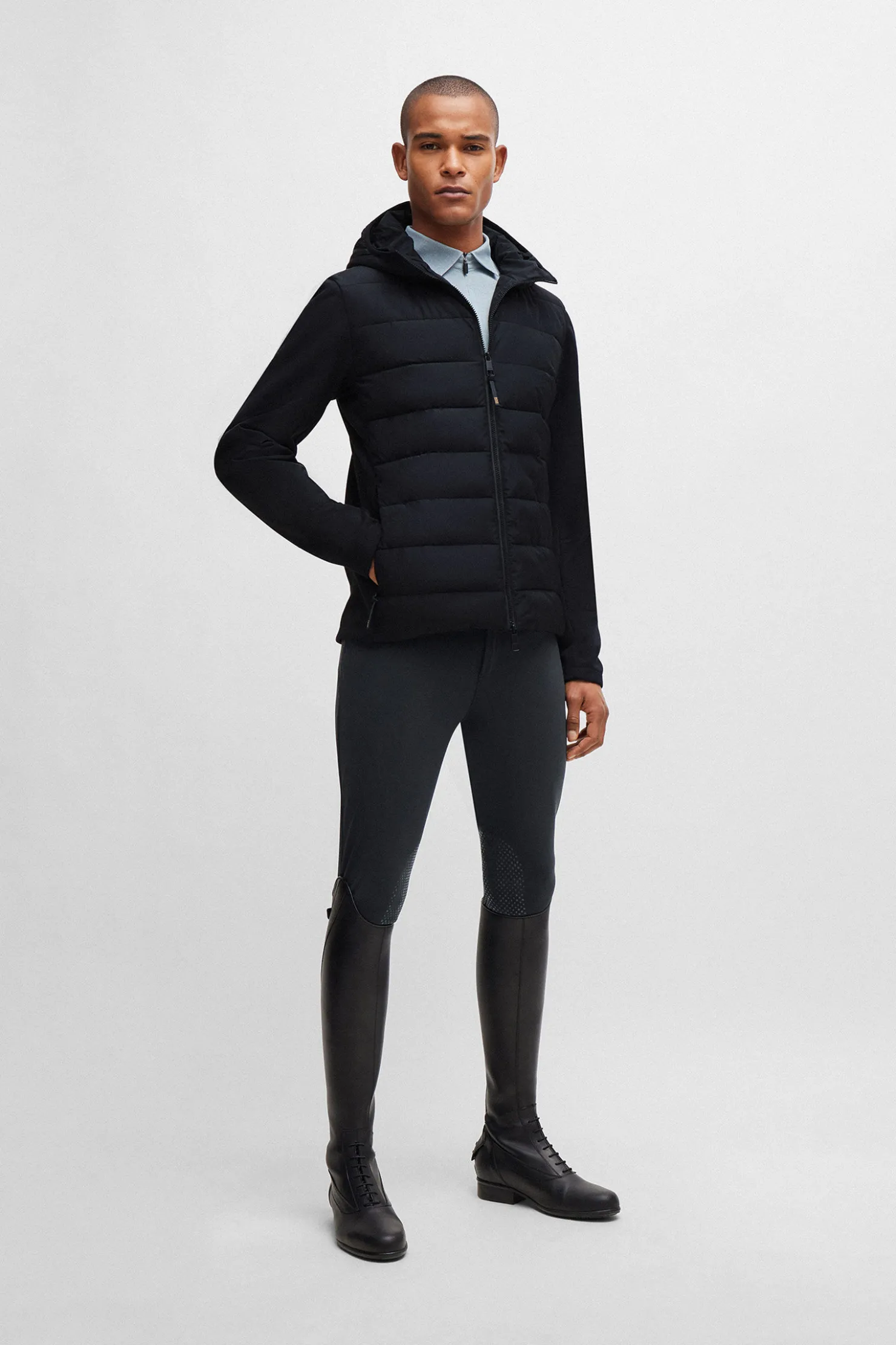 Lett 2. lags blanding av dunjakke og softshelljakke.Softshellfiber på ermene og sidepanelene, front og øvre rygg i dunfylt nylon.
