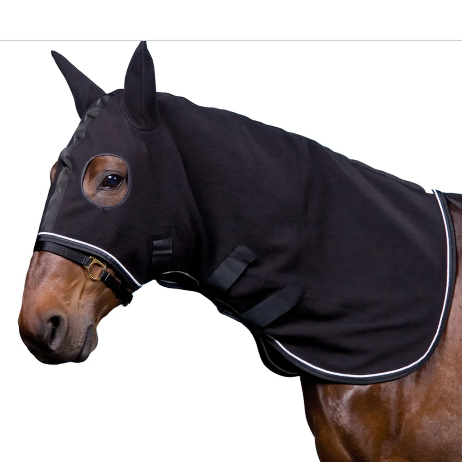 Nakkestykke i fleece til bruk med dekken 24636 eller 24641. Tørker og beskytter hodet, ørene og nakken på hesten på kalde vinterdager. Utstyrt med tre borrelåsfeste.