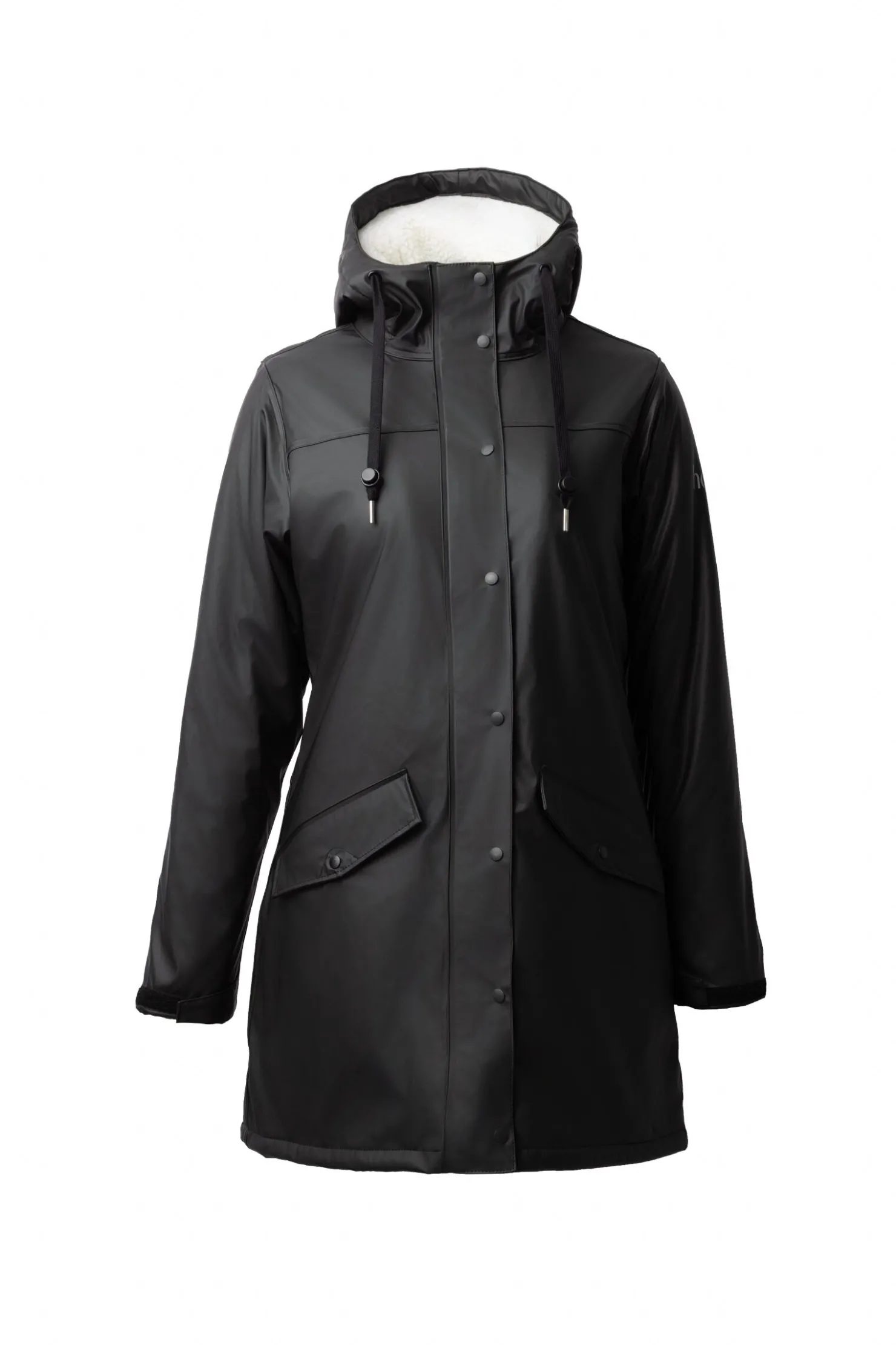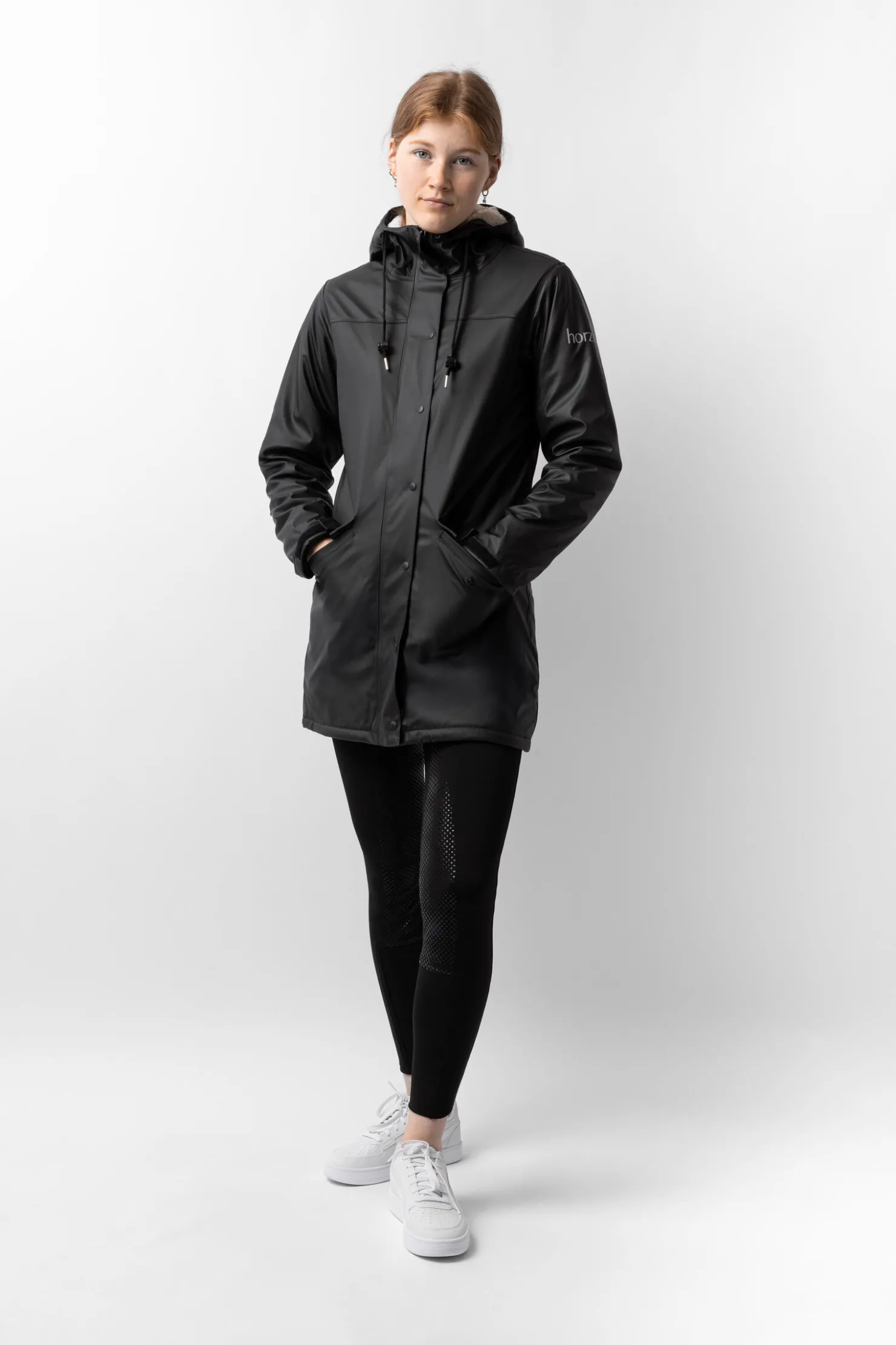 En hette med drasnor holder fukt unna, og den fluffy innsiden i teddyfleece hjelper deg med å holde deg varm og tørr når du bruker denne klassiske regnjakken. Horze Billie PU regnjakke er utviklet for å beskytte deg mot været med justerbare ermer, en toveisglidelås og trykknapper foran. De store lommene oppbevarer nøkler, godbiter og andre nødvendigheter slik at du kan bruke denne jakken både i stallen og når du rir. Det reflekterende trykket på ermet gir noe ekstra synlighet på mørke, dystre dager. Lengden på denne jakken sikrer full beskyttelse mot været.