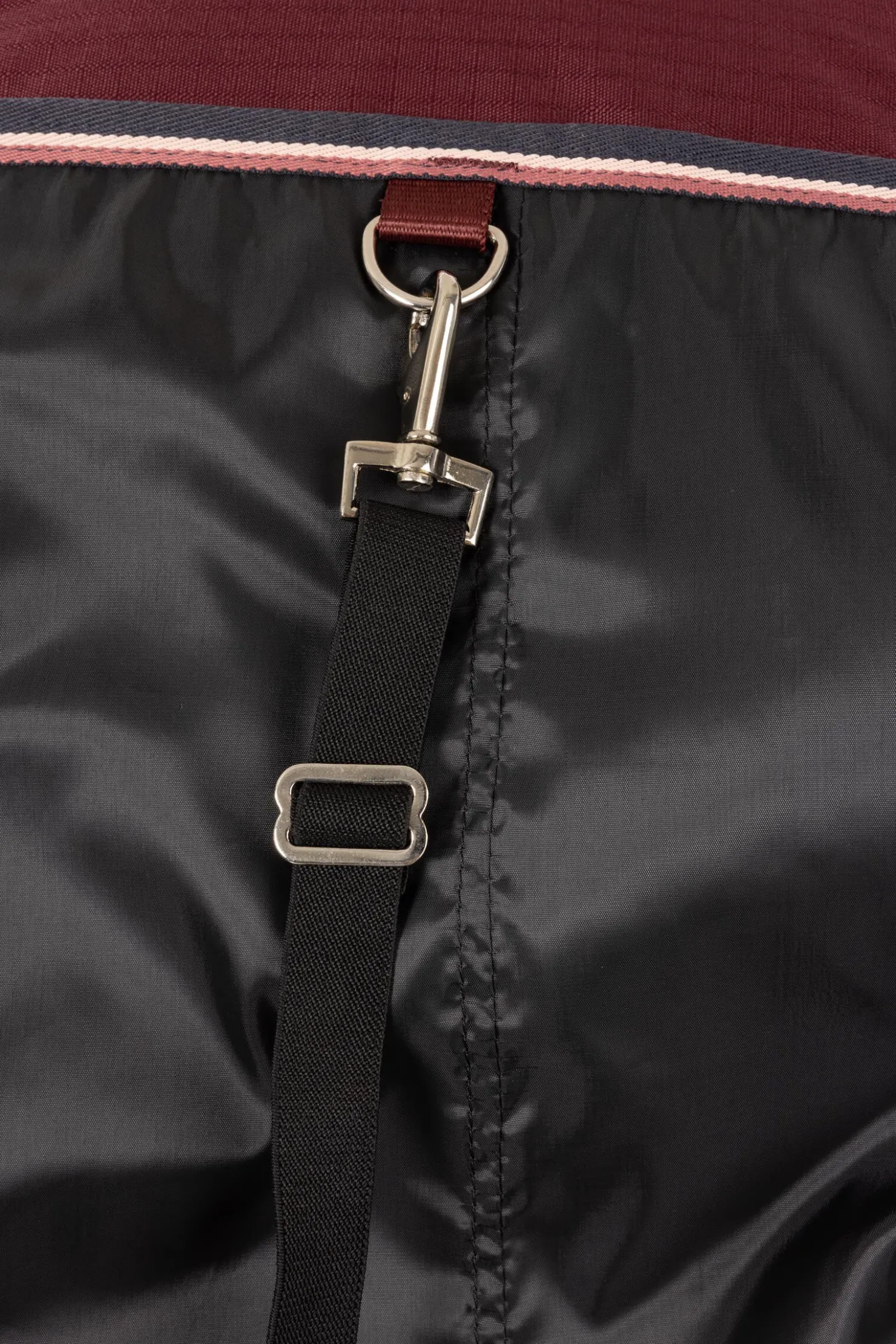 Dette vanntette regndekkenet er laget av et pustende stoff som holder hesten din tørr og komfortabel. Den gode passformen ved skuldre og nakke forhindrer at dekkenet sklir, og høye bogsplitter gir bevegelsesfrihet. De to spennene foran, kryssgjordene, beinsnorene med klips og haleflappen gir den perfekte beskyttelsen hesten din trenger.