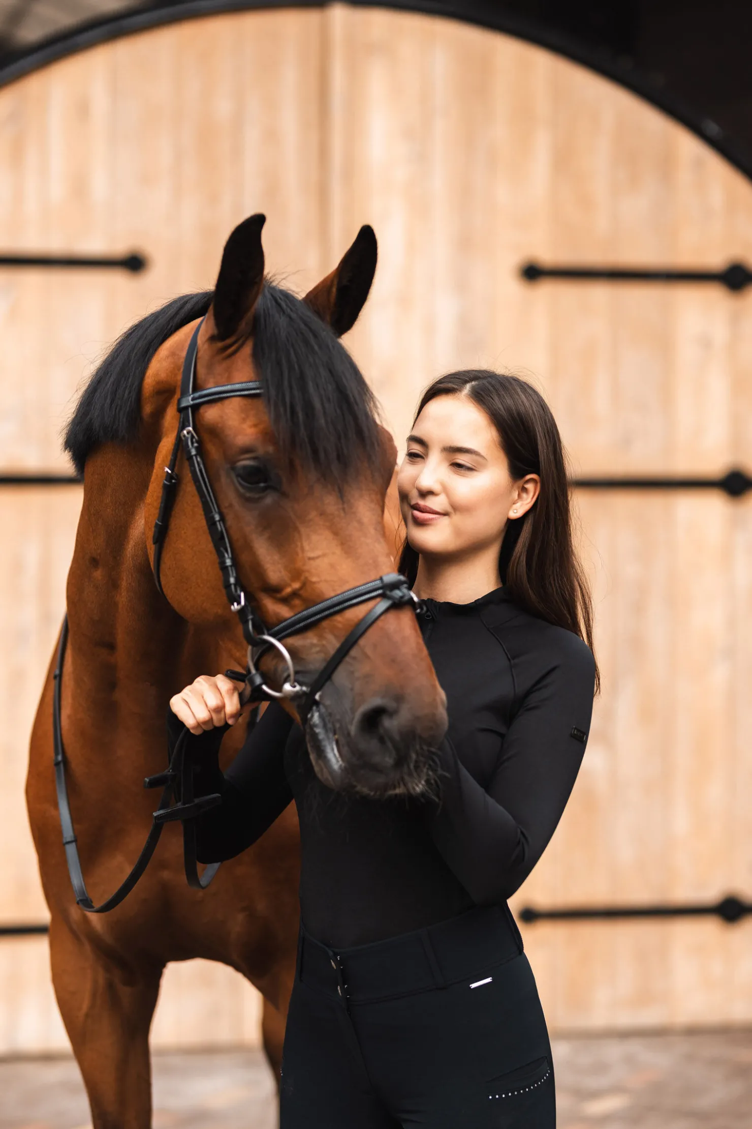 Dette hodelaget kommer med en avtakbar nedre nesereim, slik at du kan tilpasse hodelaget etter behovene til hesten din. Den myke polstringen ved nakken og på pannereimen sikrer optimal komfort og forhindrer gnag. Det enkle designet på nakkestykket gir et rent og elegant utseende. Kontrastsømmen gir et sofistikert preg på hele designet. Det formede pannebåndet med logodetaljer er et diskret blikkfang.