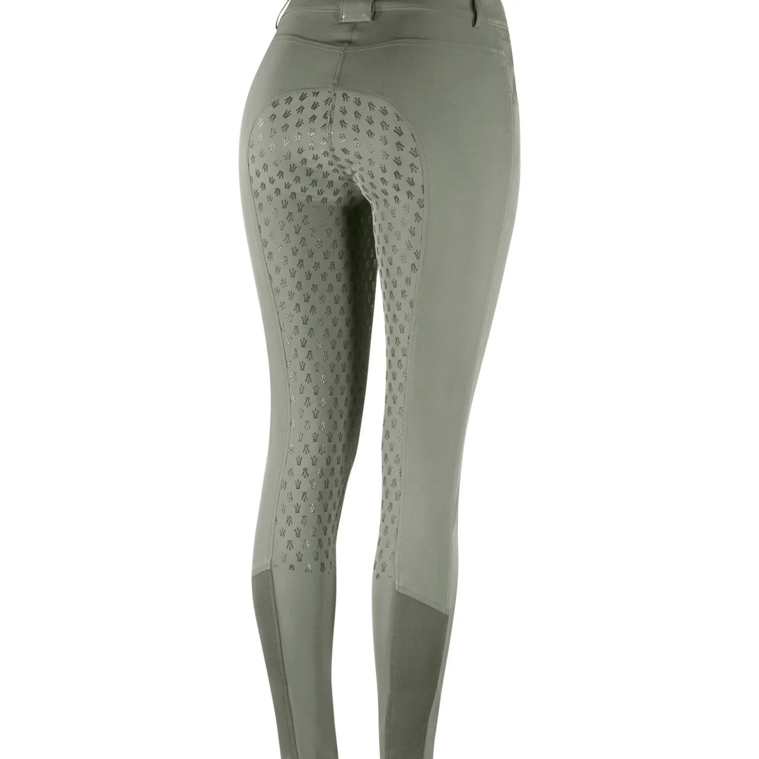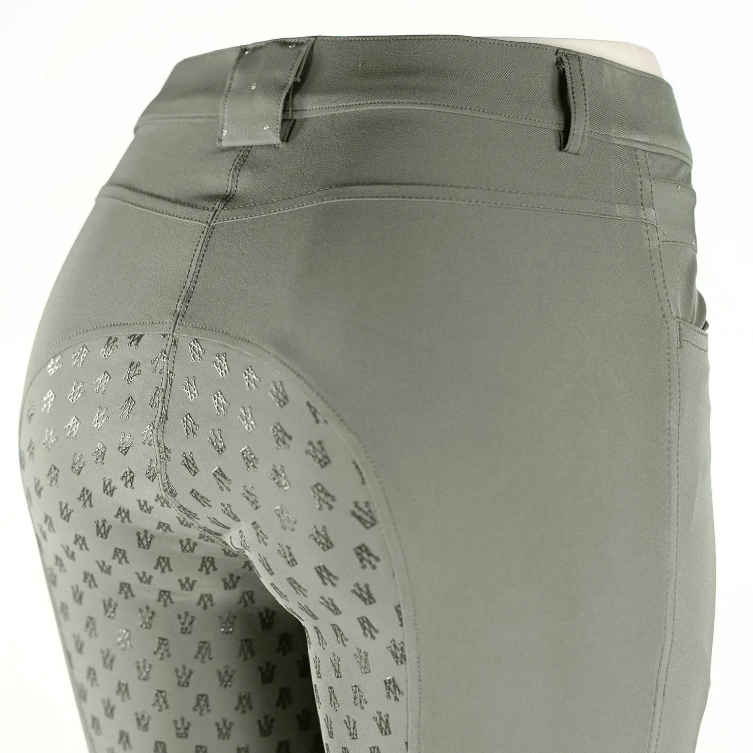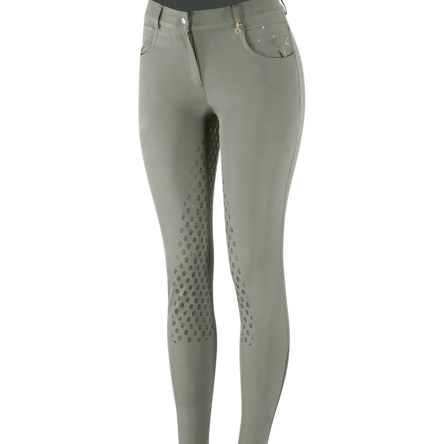 Horze Sienna helforsterket ridebukse med silikon til dame er nydelig og har masse trendy design, som bronseglitter på lommene og livet, og kronemotiv på silikontrykket, noe som hjelper med å holde deg i balanse og kontroll i salen. Frontlommene er ideelle for å ha med deg telefonen. Det fireveis stretch-stoffet er støttende og eksepsjonelt komfortabelt å bruke – perfekt for lange dager i stallen.