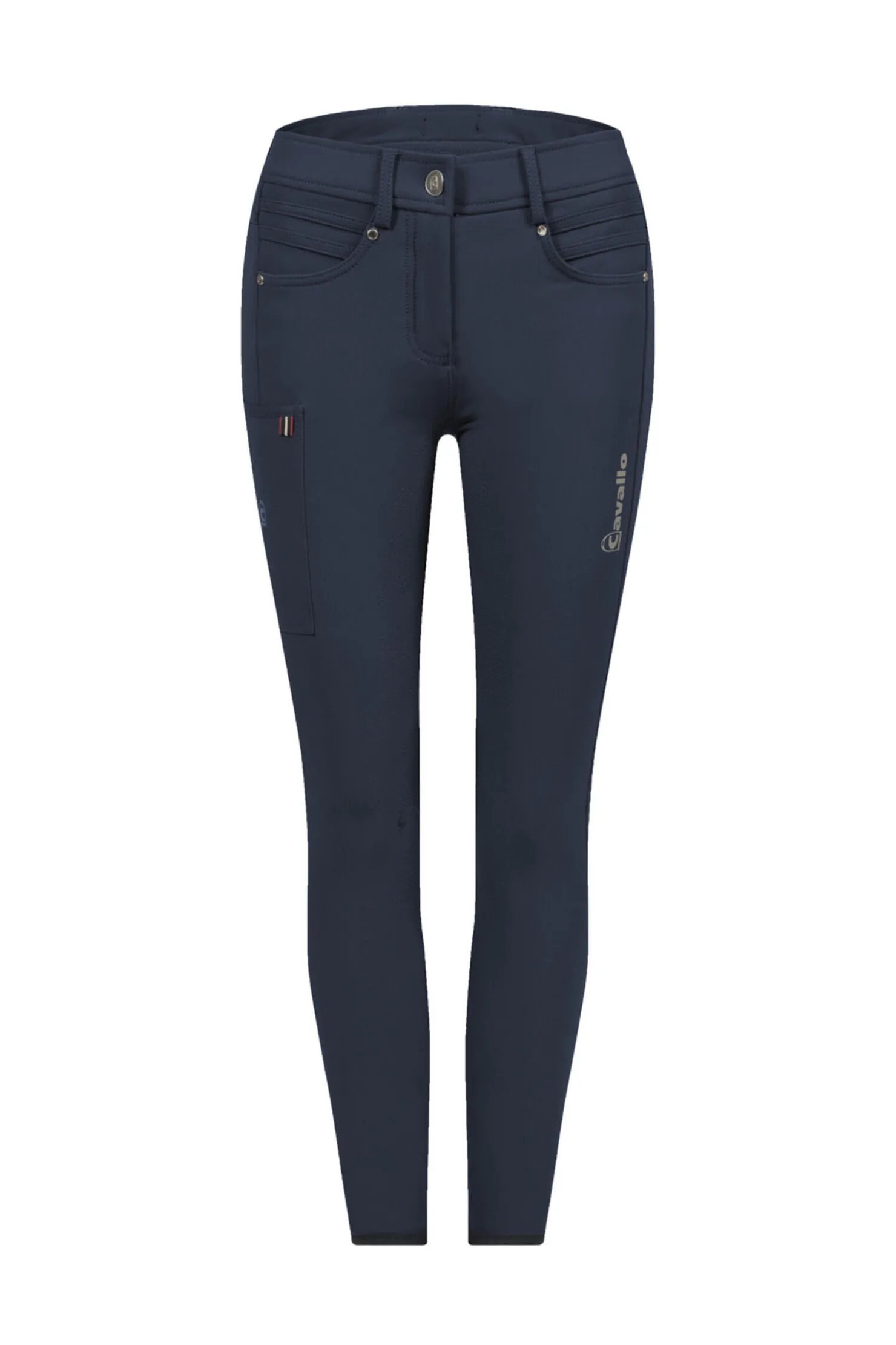 Sportslige ridebukser med fem lommer.To komfortable frontlommer er dekorert med glitrende krystaller.Telefonlommen har det typiske stripete Cavallo-båndet, og stigbøyletrykk.En ekstra glidelåslomme bak gir plass til å gjemme vekk verdisaker.Ridebuksene kommer med ultimat brukskomfort takket være ingen forstyrrende sømmer ved kneet.Det sofistikerte sømdesignet bak på ridebuksene tryller frem den perfekte, sporty figuren.