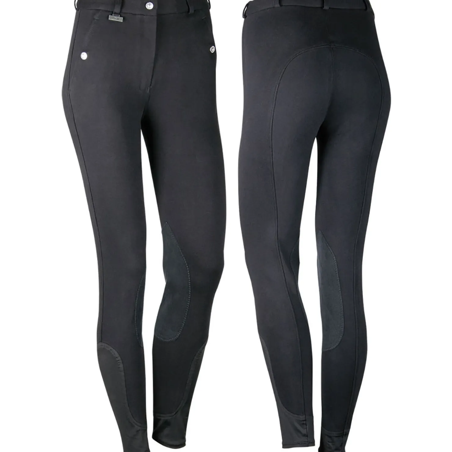 Ridebukse med glidelås, trykknapper på lommene, beltehemper og fleksibel på leggene.