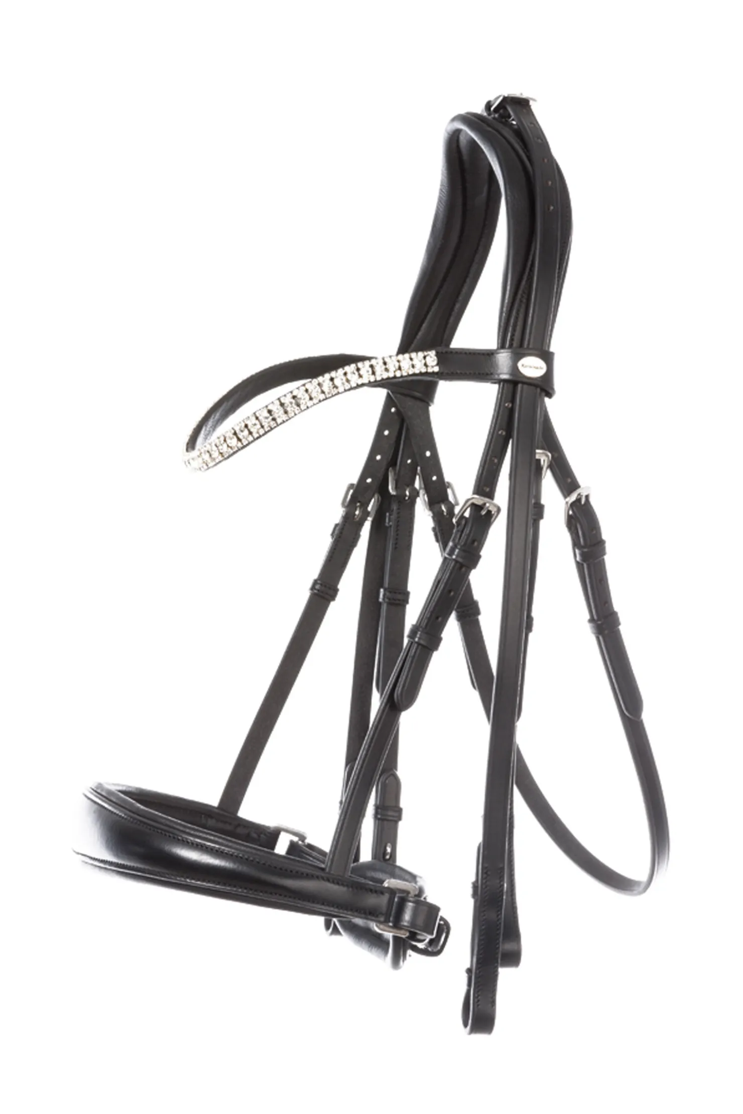 窶彜onya窶øykvalitets, vegetabilsk garvet lær. Neseremmen kan justeres på begge sider. Det polstrede og anatomisk utformede hodebåndet og den avsmalnende, mykt fôrede neseremmen sørger for ekstra komfort. Det smale pannebåndet er buet og dekorert med hvite rhinestones.