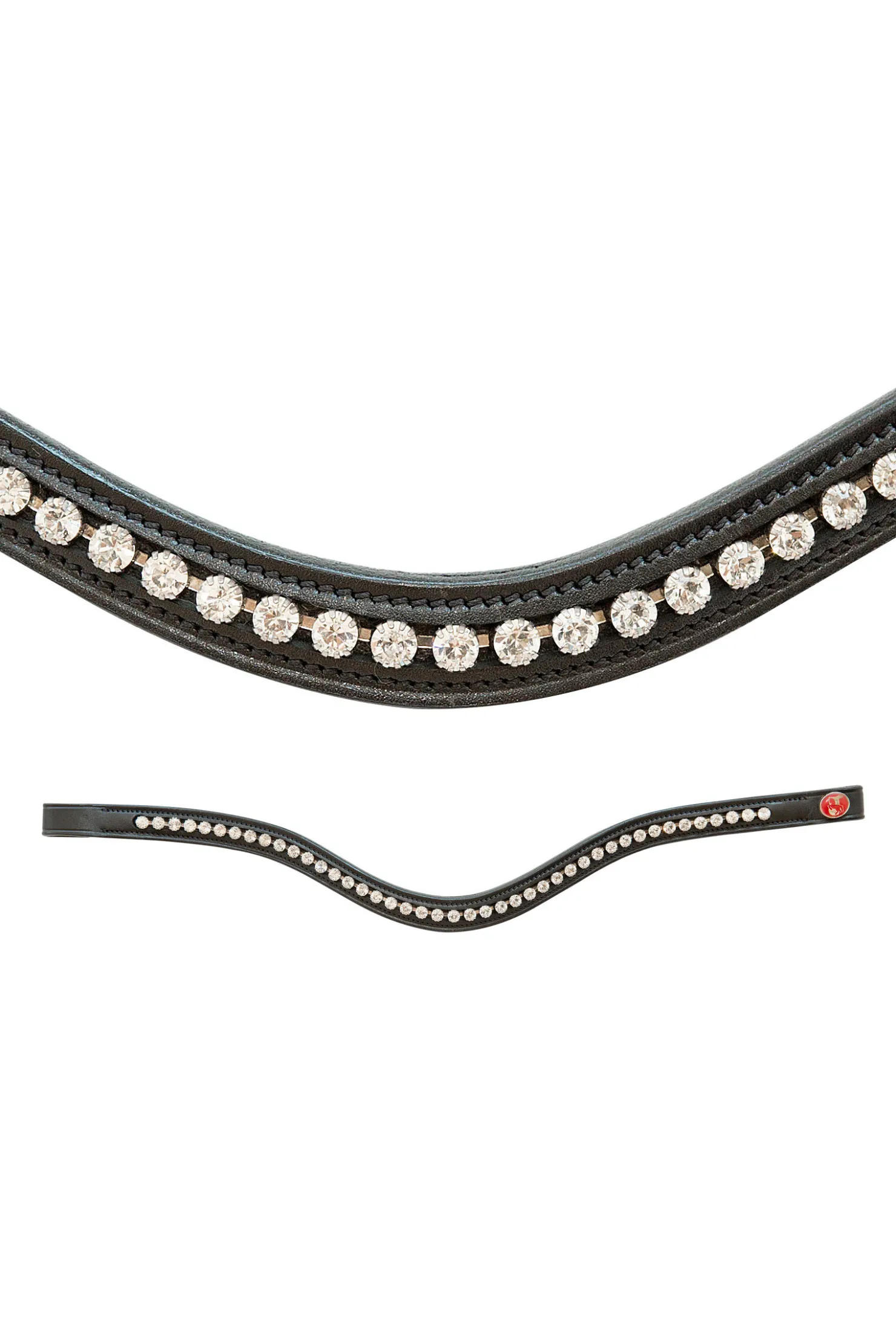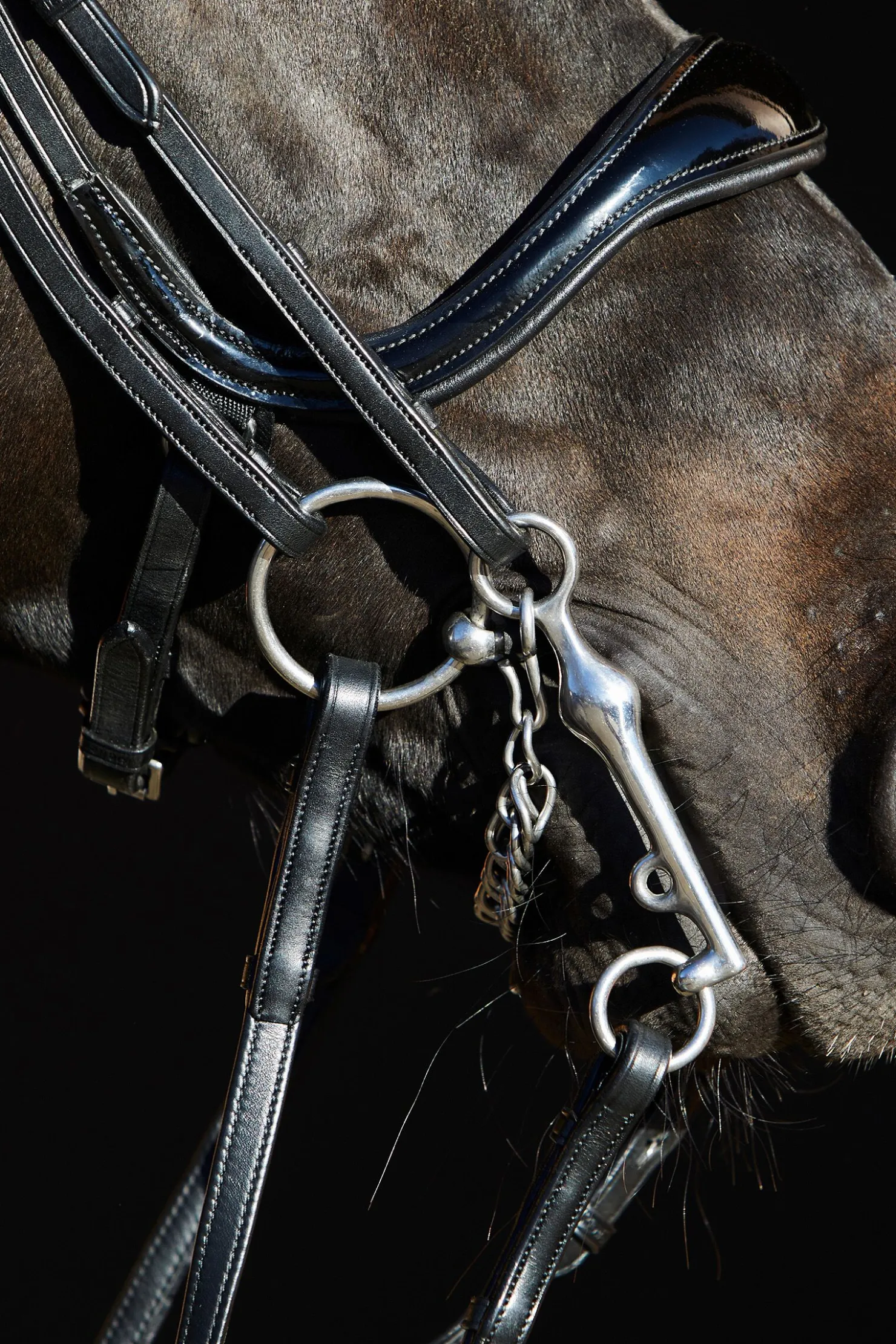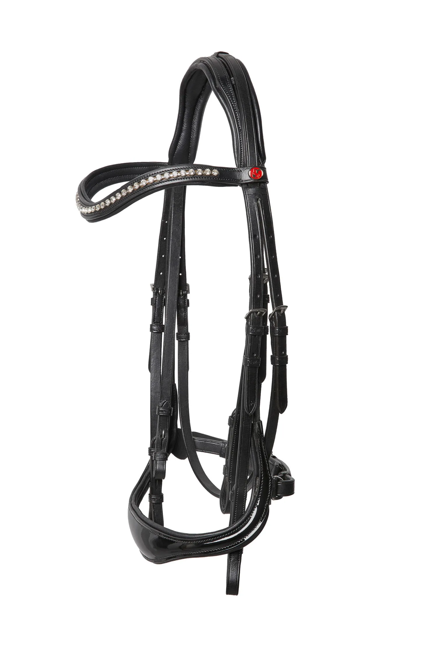 Kieffer® Ultrasoft Amy kandarhodelag kommer med pullback nesereim med en meget komfortabel form som tar hensyn til hestens sensitive hode, med alle ansiktsnerver og blodkar.Suksessen med konseptet til de vanlige anatomiske Kieffer hodelagene er nå også tilgjengelig som en eksklusiv kandar-modell.Det anatomisk formede nakkestykket ‘Comfort’ med smørmyk kontaktflate og cut-back ved ørene sikrer mild trykkfordeling på nakken.Den like godt polstrede og anatomisk formede nesereimen med avrundet form passer perfekt på hestens hode, og unngår de mest sensitive nervene.Den elegante, buede nesereimen i blankt lær og pannebåndet dekorert med hvite krystaller gir en ordentlig «WOW»-effekt på dressurbanen.