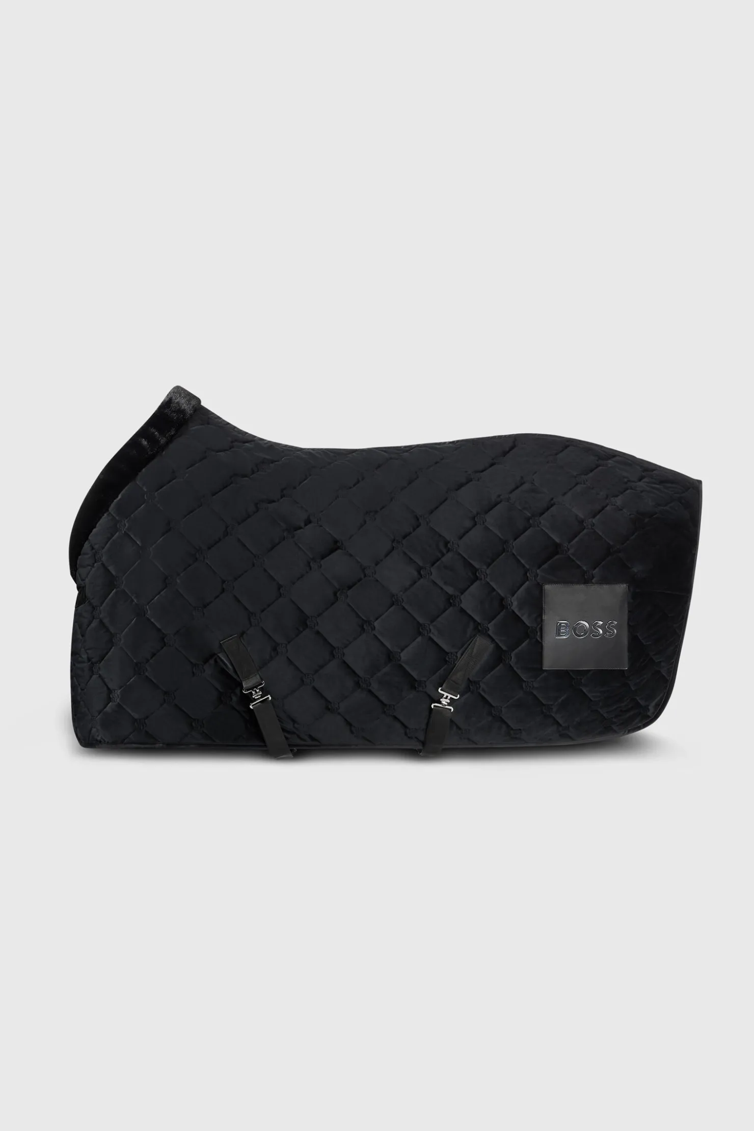 BOSS stevnedekken er anatomisk formet og har en perfekt passform. Den kunstige sauepelsen i nakke-, manke- og brystområdet sikrer en behagelig passform. Den ekstremt myke fløyelsyttersiden med BOSS-logoquilt over hele ser veldig luksuriøs ut. High-tech fiberet på innsiden forhindrer gnag og skaper små luftbobler som fanger og holder på kroppsvarmen. I tillegg får hestens pels glans ved kontakt med dette myke innermaterialet. Forholdet mellom varme og vekt maksimerer komforten for både rytter og hest. Det trelags diamantquiltet gjør stevnedekkenet svært slitesterkt og forhindrer at flis setter seg fast i stoffet. Den doble frontlukningen, magestroppen og halesnoren fullfører sikkerheten til stevnedekkenet.