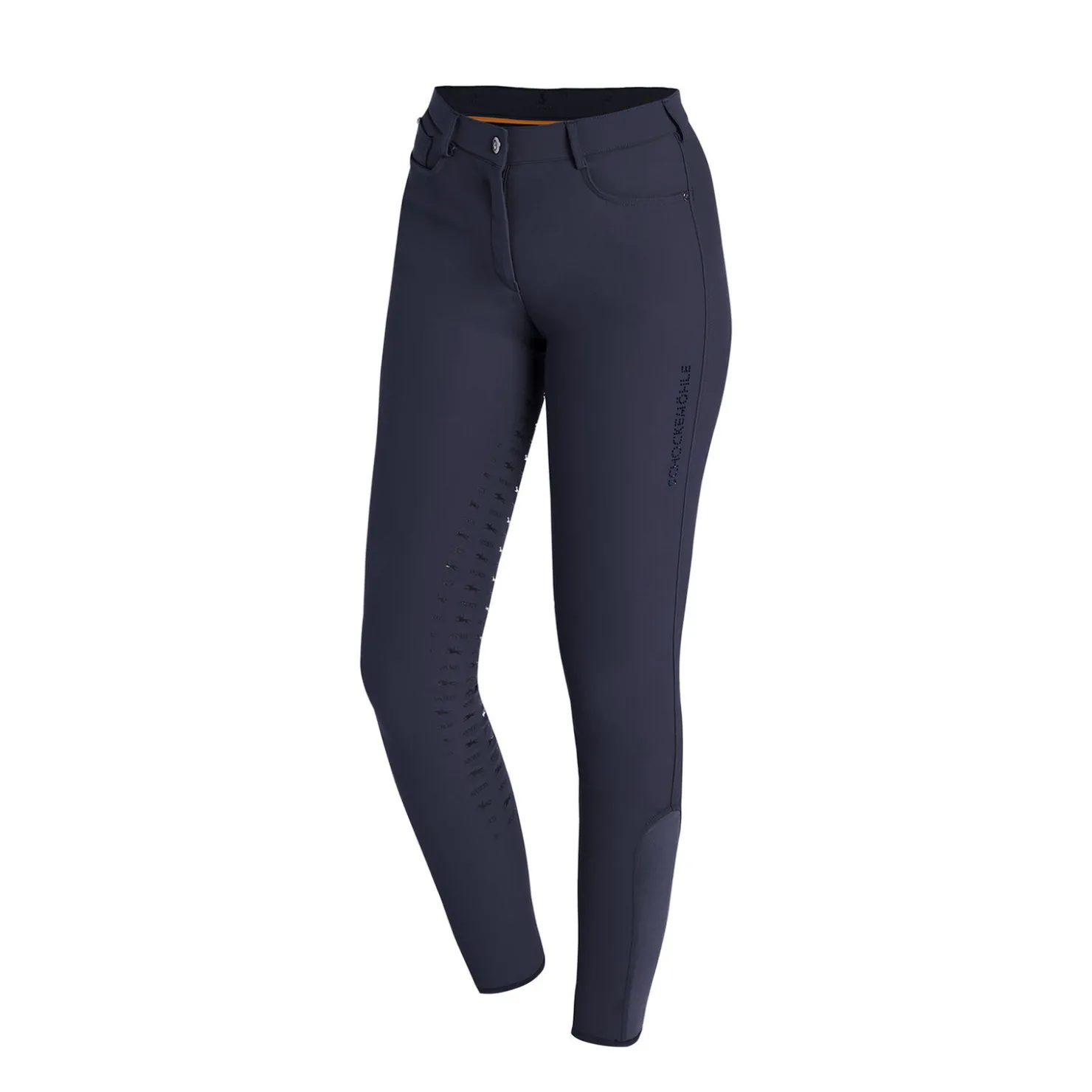 Pustende, fleksibel og holder allikevel formen: Chayenne helforsterket ridebukse til dame fra Schockemöhle Sports overbeviser med maksimal funksjonalitet.Det elastiske stoffet er fukttransporterende og gir UV-beskyttelse.Også praktisk: den runde lommen med ekstra liten myntlomme.Det helforsterkede setet gir god støtte i salen.En logo med pyntesteiner på venstre ben og uekte lommer dekorert med glitterteip bak på ryggen lar sporty ryttere skinne!