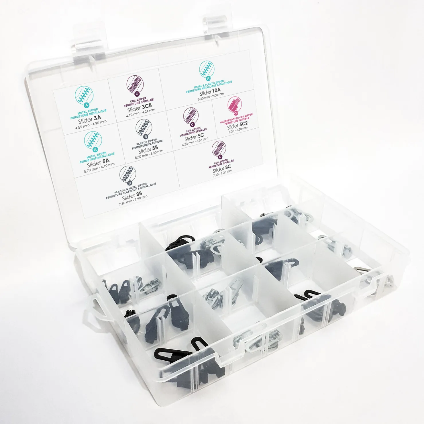 Spesiell kundeservice-boks. Laget for profesjonelle butikker. Inneholder 5 av de mest brukte glidelåsene.3CB (for coil glidelås): 3 svarte og 2 sølv.5A (for metallglidelås): 3 svarte og 3 gammel messing.5B (for plastglidelås): 3 svarte og 2 sølv.5C (for coil glidelås): 3 svarte og 2 sølv.8B (for plastglidelås): 3 svarte og 2 sølv.8C (for coil glidelås): 3 svarte og 2 sølv.