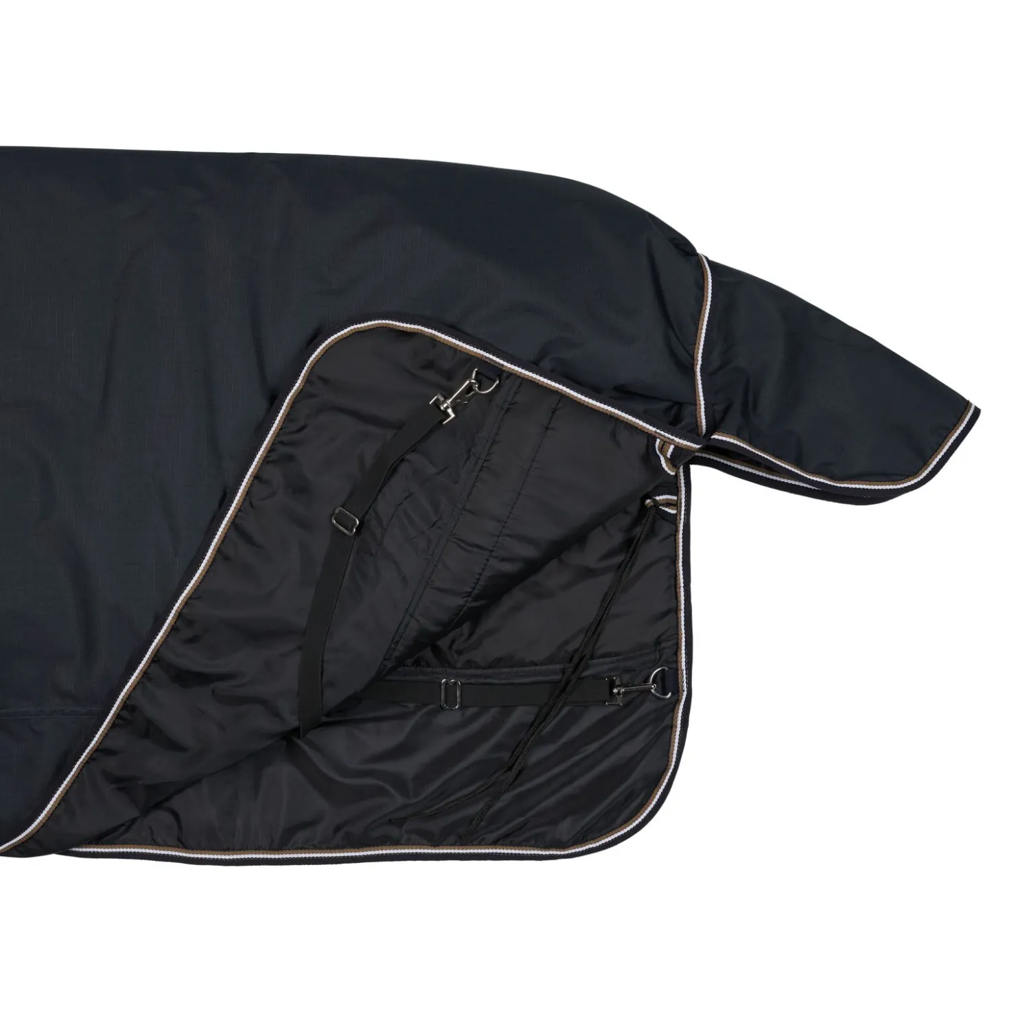 Dette dekkenet er laget av vanntett, pustende stoff.Den gode passformen ved halsen og skuldrene gjør det komfortabelt, og de høye bogsplittene gir mye bevegelsesfrihet.Frontspennene, kryssgjordene, beinsnorene og haleflappen gjør at dekkenet ligger sikkert på hesten .