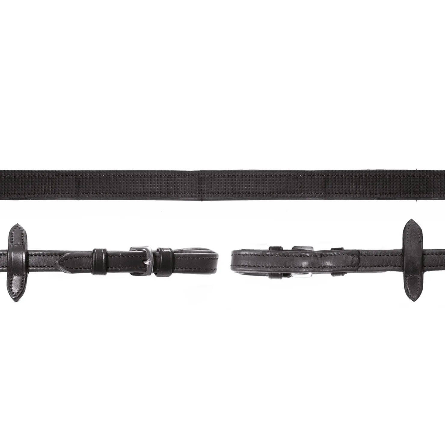 DURASOFT GRIP TØYLER: Disse innovative og nye tøylene har en slitesterk nylonkjerne. Tøylene er helt dekt med en robust web, inkludert tøyleløkkene. Kvaliteten på kjernestoffet ligner materialet i setebelter. Lærkvaliteten er holdbar, men også eksepsjonelt mykt og behagelig. Maksimalt grep sikres med kombinasjonen av lærstopperne og en gummidekt bakside. Tøylene er utstyrt med martingalstoppere, og er 16 mm brede.