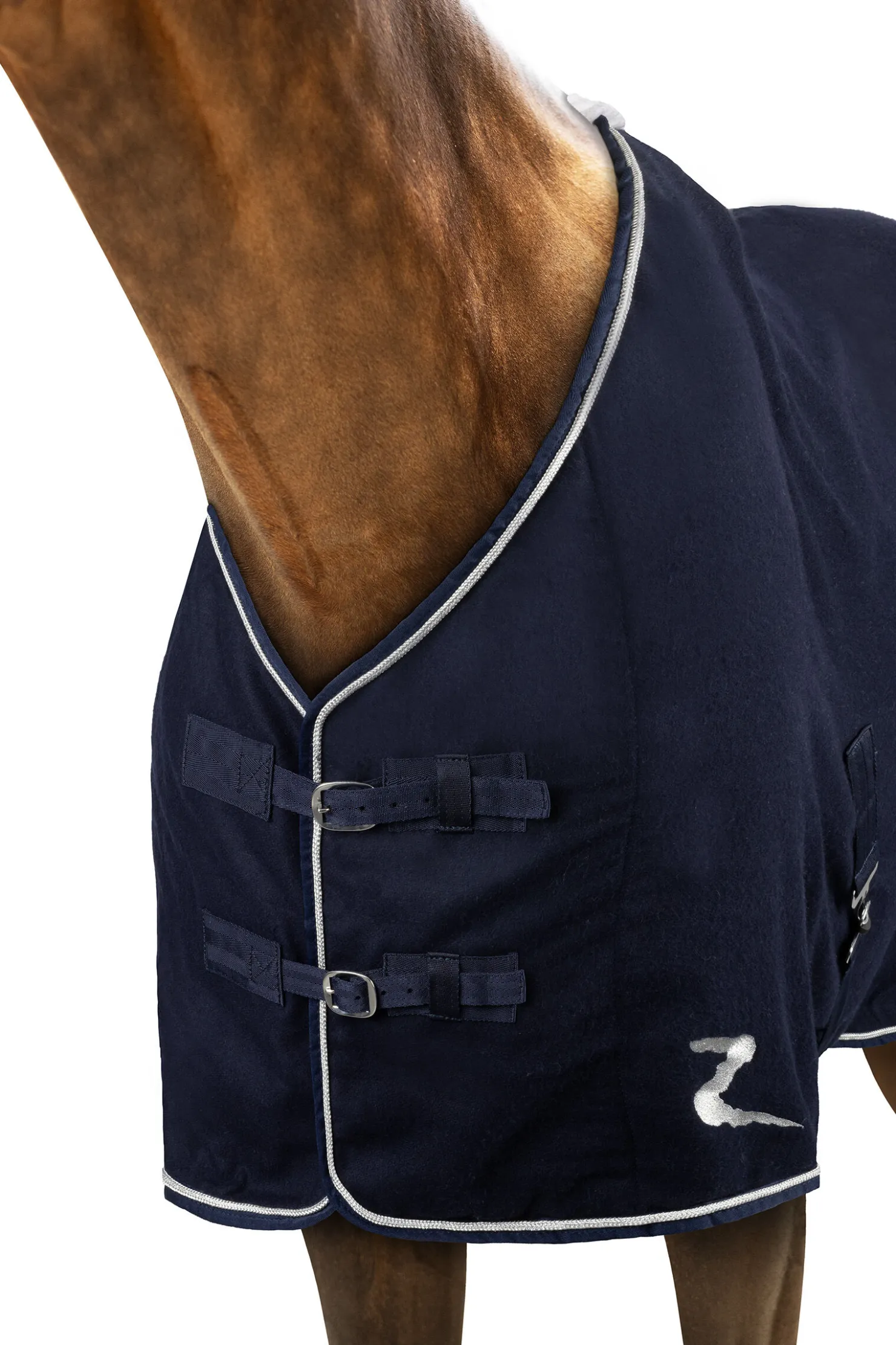 Tykk, rik ull med mye sølvdetaljer gjør dette dekkenet til et perfekt valg å bruke når du skal ut blant andre. Den markante utsmykningen på hoften er et klassisk design og komplimenterer det nydelige kantbåndet i sølv, og Z-logoen. Dette pene dekkenet vil bli ditt favorittvalg når du er ute og reiser, ettersom hesten vil komme fram frisk og pen når den lastes av for ditt neste stevne. Pustende ull betyr at hesten vil holde varmen, samtidig som den ikke blir for varm. Det holdbare designet ser deilikat ut, men er solid, og holder i vask slik at dekkenet kan brukes sesong etter sesong.