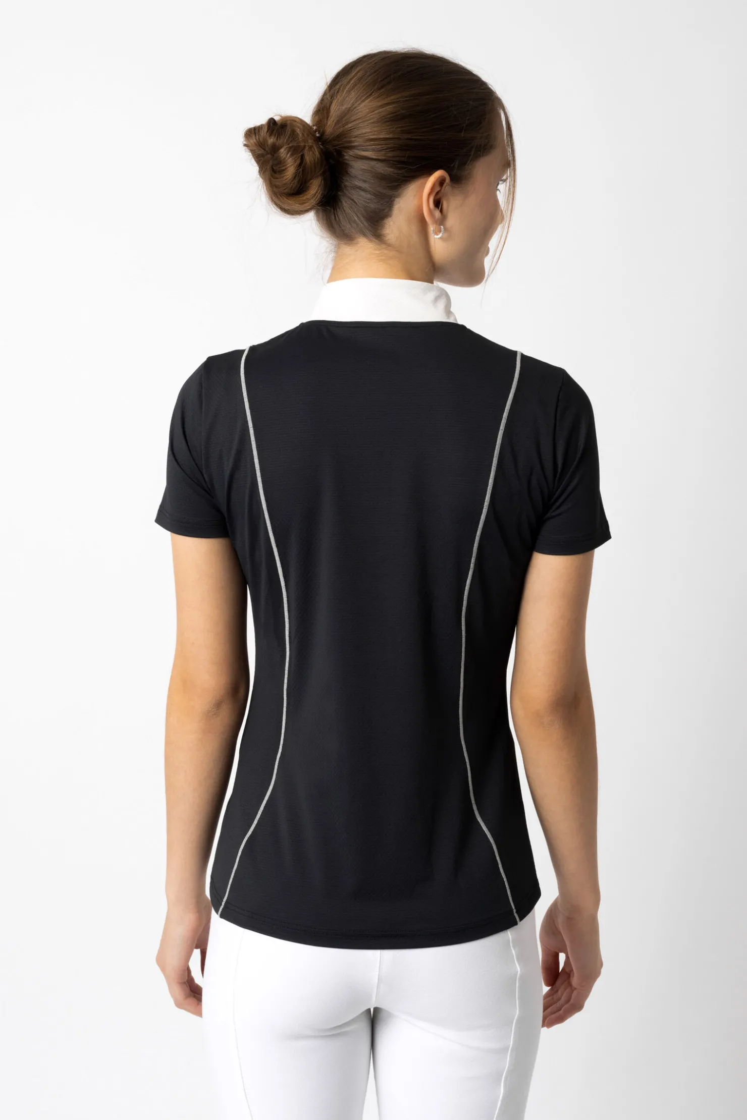 - Lett sommerstoff. Pustende. Elastisk. Hurtigtørkende. Mesh-innlegg på siden. Logodetaljer på venstre bryst. Halv glidelås. Stående krage