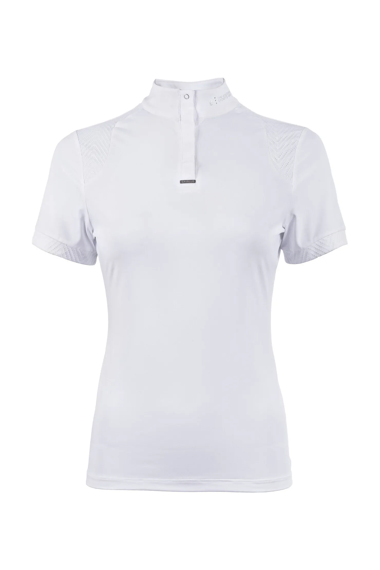 - Hvit ståkrage med glitrende sølv Cavallo-logo med rhinestones på venstre side