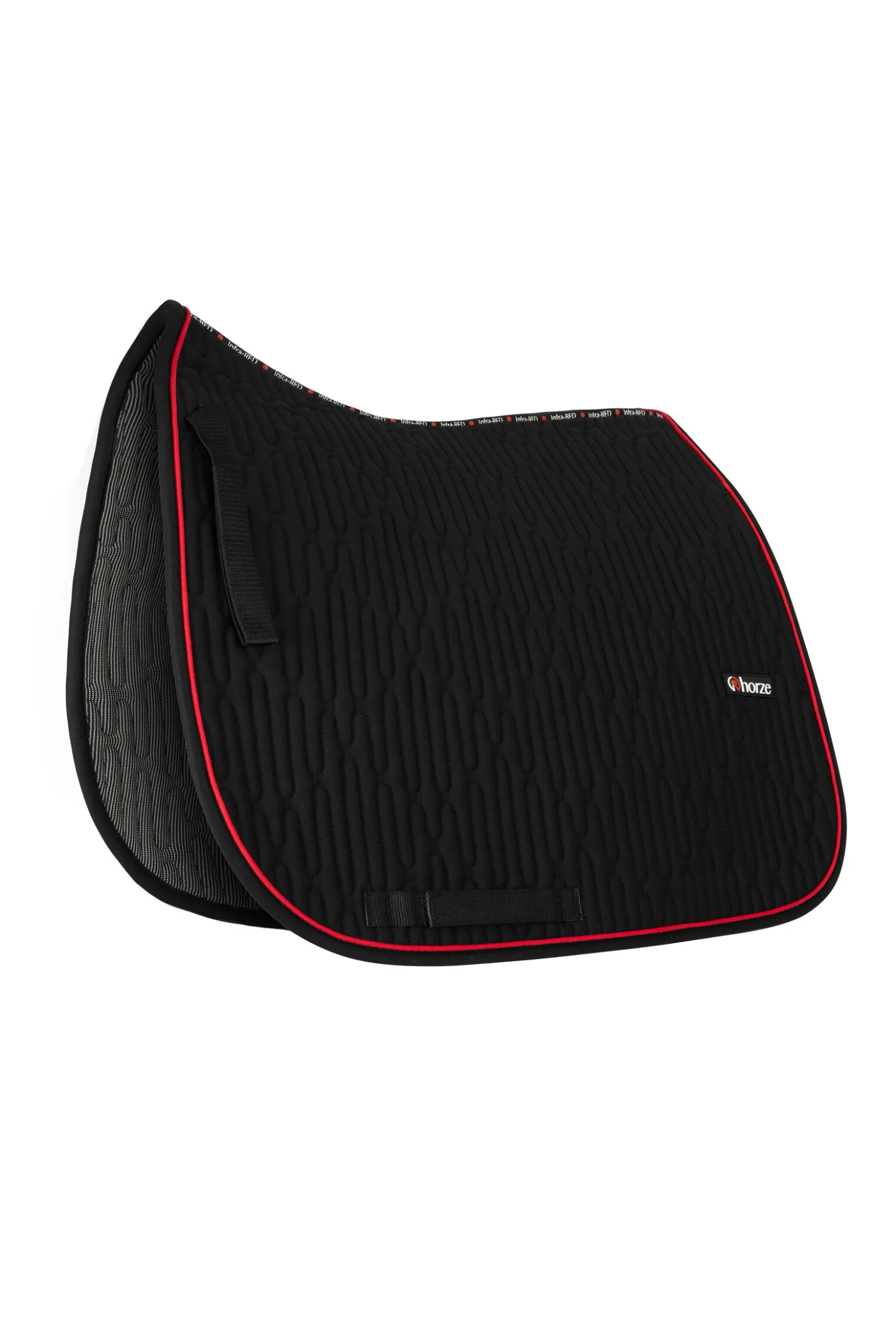 Enkel, men samtidig elegant og svært funksjonell sjabrak med en overside i bomullstyll og infrarødt stoff på innsiden. Mesh langs ryggraden øker pusteegenskapene under salen, noe som er praktisk på harde treningsøkter eller på varme sommerdager. Korte D-ring-fester med strikk og gjordstropper som kan åpnes holder salen trygt på plass. Rødt kantbånd og logo langs ryggraden viser at denne sjabraken er en del av Cairo-kolleksjonen til Horze. De keramiske nanopartiklene som er vevd inn i stoffet absorberer energien fra hestens kropp og frigjør en lang, infrarød stråle på 8-12ølgelengde tilbake til hestens kropp. Den infrarøde strålingen er i stand til å trenge dypt inn i vevet og påvirke vannmolekyler, noe som igjen fører til varmeutslipp, som får blodårene til å utvide seg. Dette øker blodsirkulasjonen og dermed også metabolismen, noe som også gjør musklene smidige.