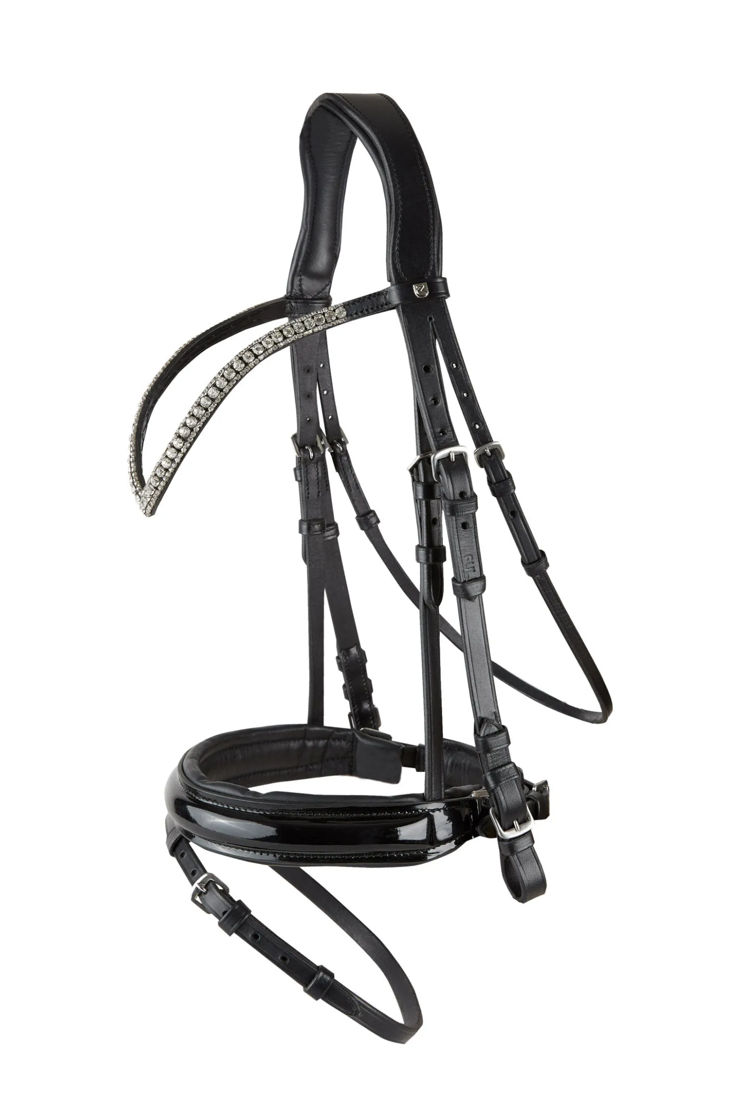 Et klassisk dressur-hodelag fôret med som ser nydelig ut, og passer helt utmerket. Den myke polstringen kombinert med det anatomisk utformede nakkestykke med ekstra plass for ørene vil gi komfort og være lett å tilpasse. Den polstrede pullback nesereimen festes enkelt og har en god passform. Nydelig, V-formet pannebånd med en smakfull rad av pyntesteiner som gir deg et snev av bling.