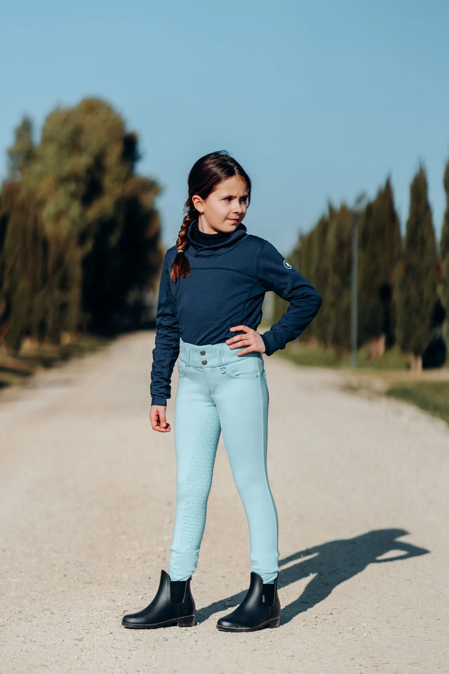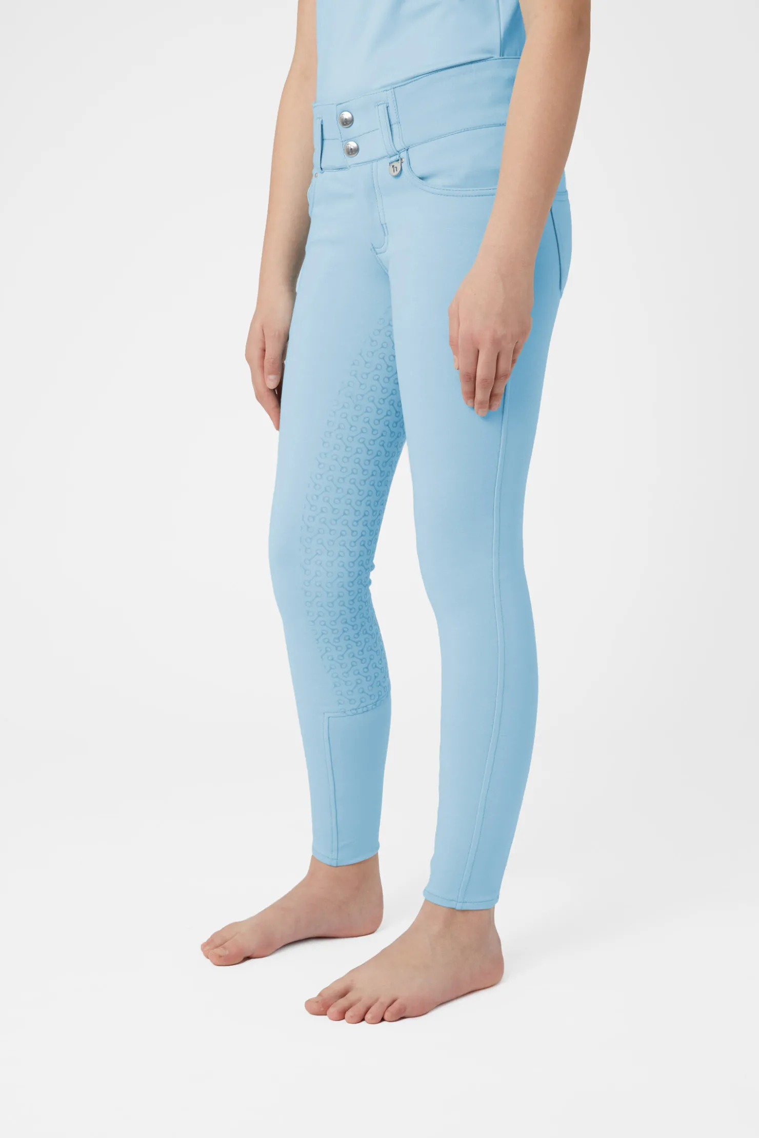 Vår Tara ridebukse er en favoritt blant mange ryttere.Disse ridebuksene kommer med et superhøyt liv som holder dem på plass.Den nye miksen av stoff er myk og komfortabel, med akkurat nok stretch.Baklommer gir en bukse-lik effekt, og to knapper fester den trygt.Helforsterkingen er laget av sterk silikon som vil holde den unge rytteren i salen.