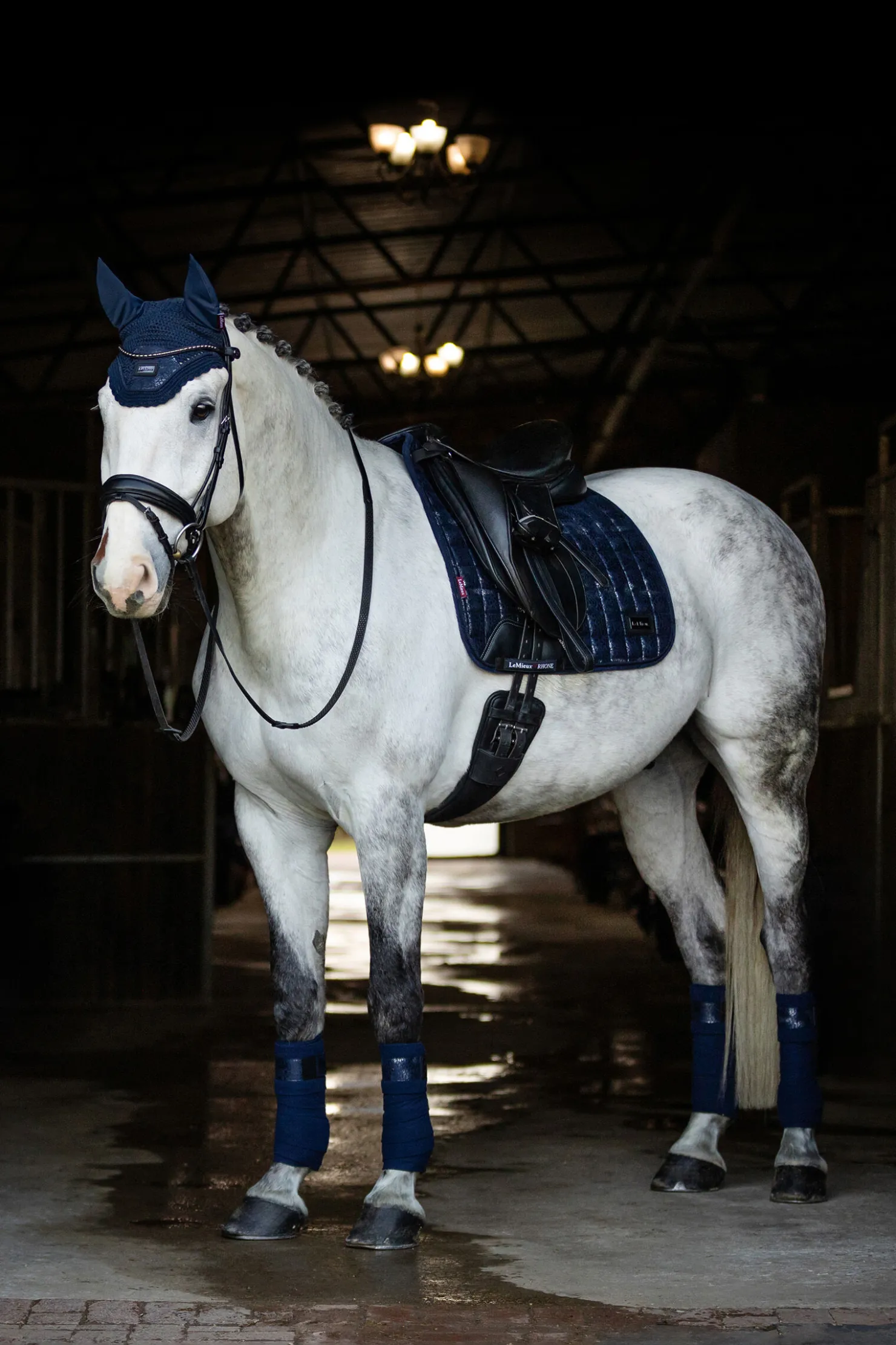 Ferdig med en metallisk trykk og merket, kombinerer dette supermyke suedepadde eksepsjonell kvalitet med iøynefallende stil. Den unike formen er designet for å passe til et bredt spekter av dressursaler, absorberer støt og gir ekstra polstring under salen.Vår banebrytende bambusfôr regulerer kroppstemperaturen ved å fjerne svette og fuktighet direkte fra huden til hesten din. Det minimerer også friksjon, slik at selv de mest sensitive hestene forblir komfortable. I tillegg betyr den supermyke suedebindingen at puten vil beholde formen sin.Fullfør hesteutstyret ditt med det matchende baselaget og hat-silken.